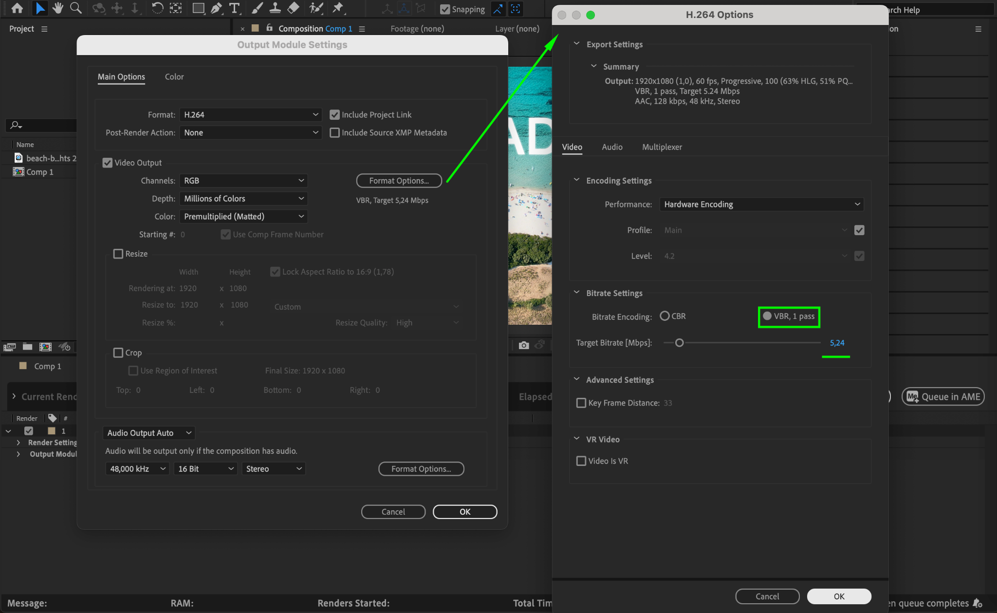 In the Render Queue, go to Format Options and adjust the Bitrate Encoding settings. Choose VBR (Variable Bit Rate) instead of CBR (Constant Bit Rate). Set: