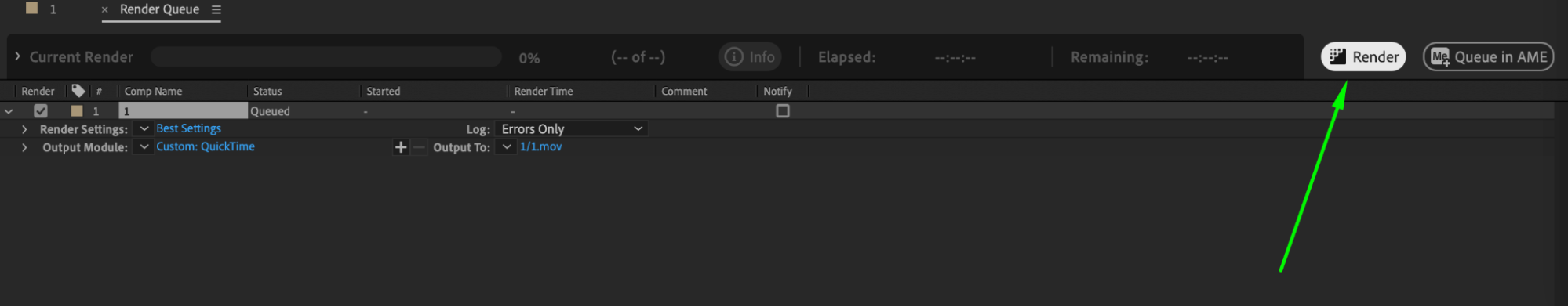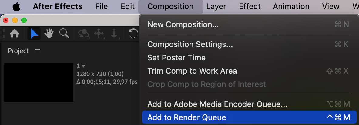Open the “Render Queue” panel via “Composition > Add to Render Queue”. Select the composition you want to export.