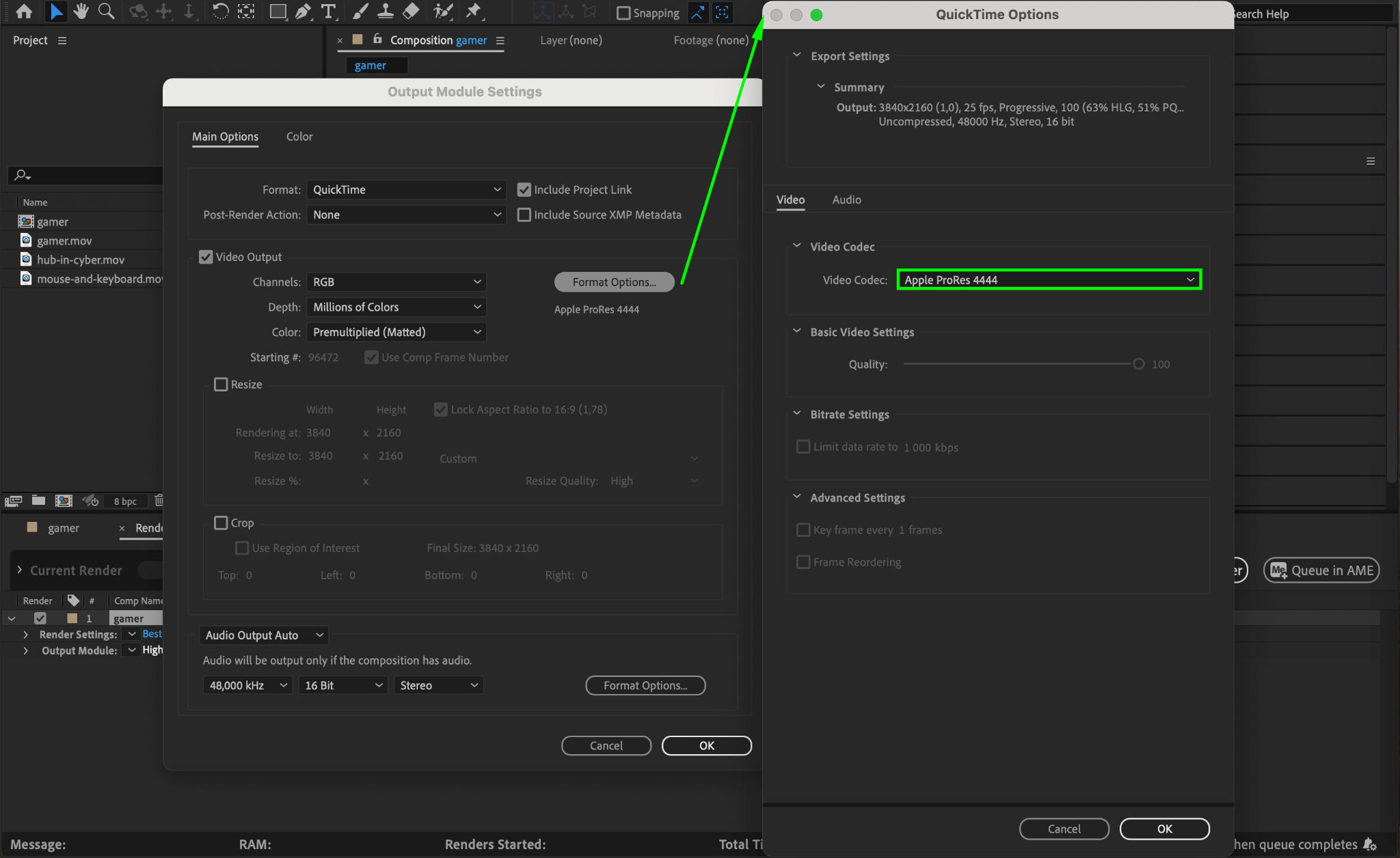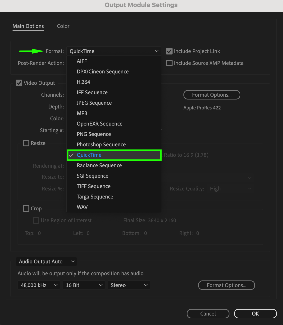 In the Output Module Settings, select QuickTime for .mov files or H.264 for .mp4 files as the format. Click on Format Options to define specific export settings, such as bitrate and quality. For QuickTime format, consider selecting the Apple ProRes 4444 codec for high quality. Adjust these settings based on your desired output quality and file size; higher bitrates typically result in better quality but larger files.