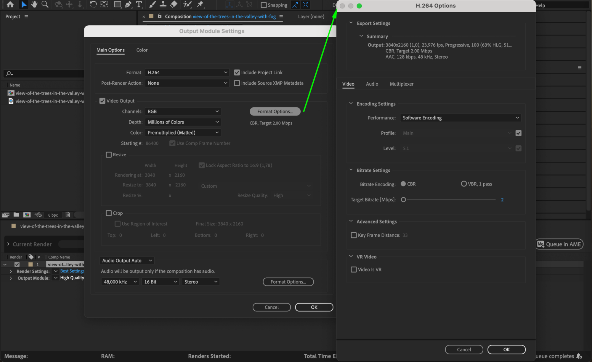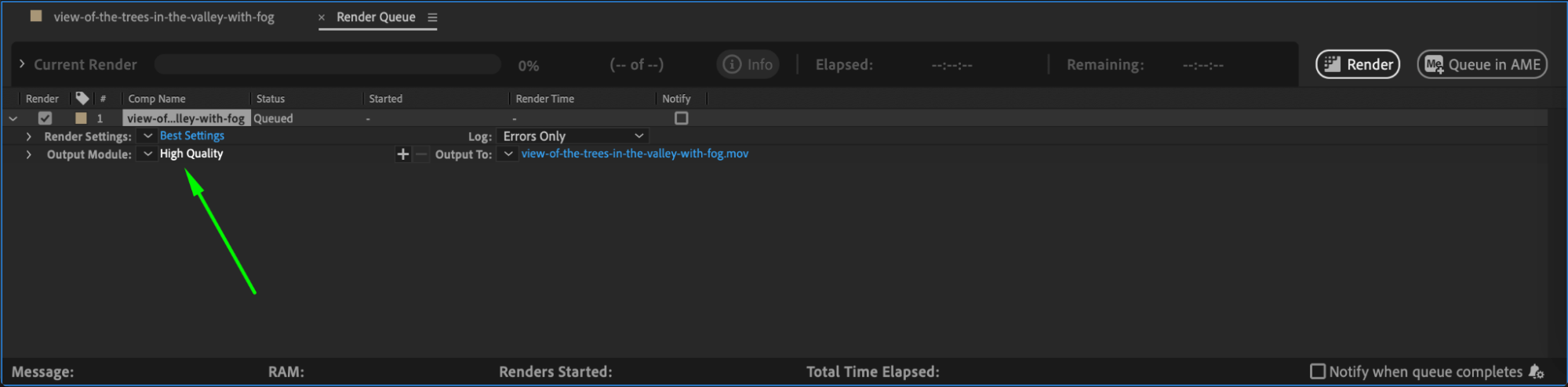To export your video as an MP4 file, you’ll need to change the output format to H.264, which is the standard format for MP4. In the Render Queue, click on the text next to “Output Module” (it might say “High Quality” by default). In the Output Module Settings window, select H.264 from the Format dropdown menu. You can also adjust additional export settings, such as the bitrate, to ensure the best balance between video quality and file size. Using H.264 ensures your video is encoded in a universally supported format.