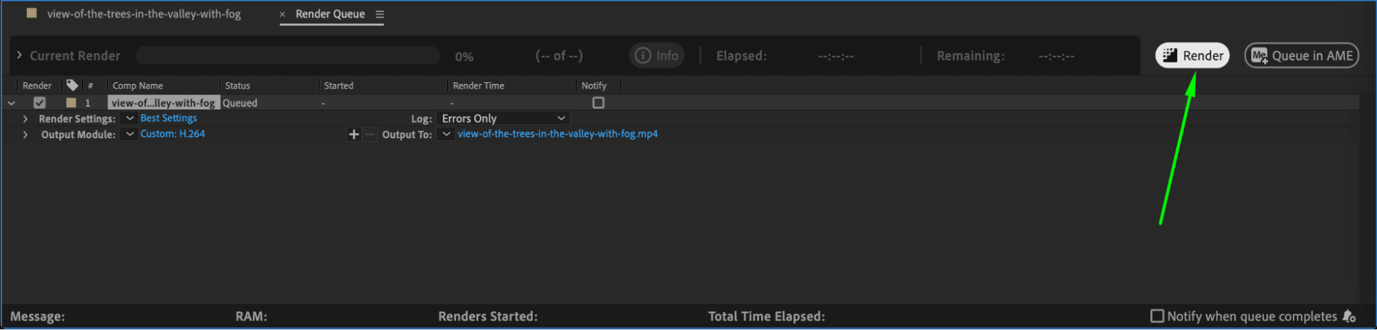 Now that all the settings are in place, it’s time to render and export your video. Simply press the Render button in the Render Queue to begin the export process. Depending on the size and complexity of your project, rendering may take some time. It’s best to avoid running other resource-heavy applications during this process to ensure After Effects can use all available resources. Once rendering is complete, your video will be available as an MP4 file in the location you specified.