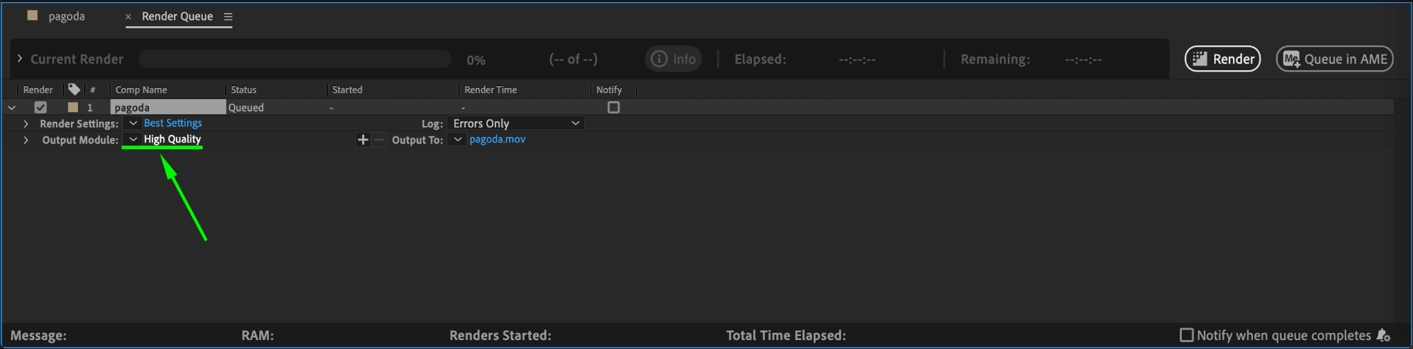 In the Render Queue panel, locate the text next to Output Module and click on it to open the Output Module Settings. This window allows you to specify the format and settings for your export.