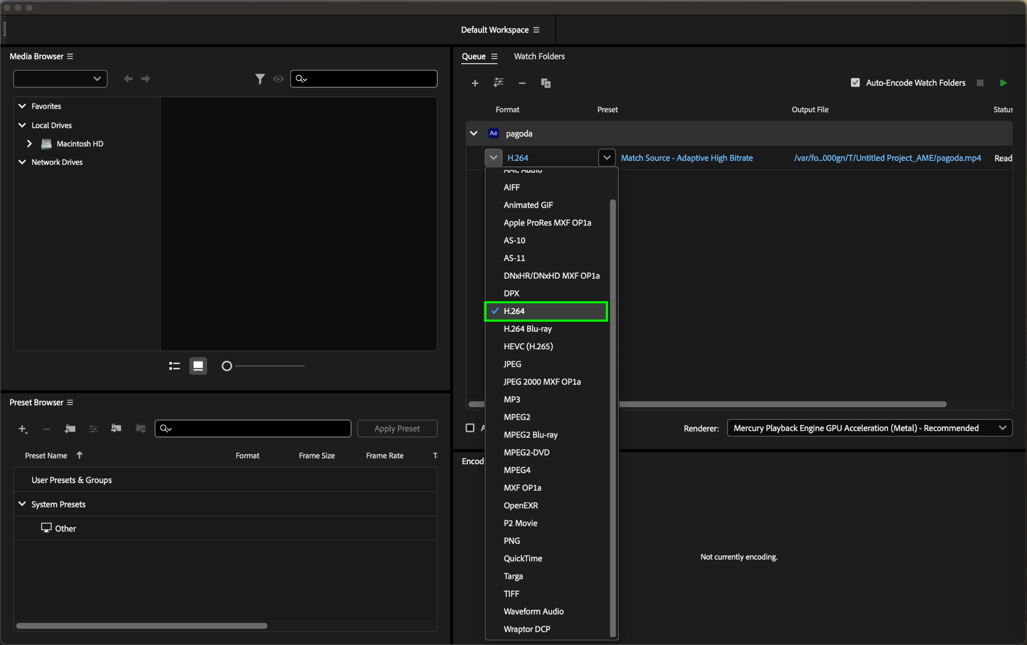 In Adobe Media Encoder, look for the Format column. Click on the default format option and choose H.264 from the sub-menu. This ensures that your video will be exported as an MP4 file.