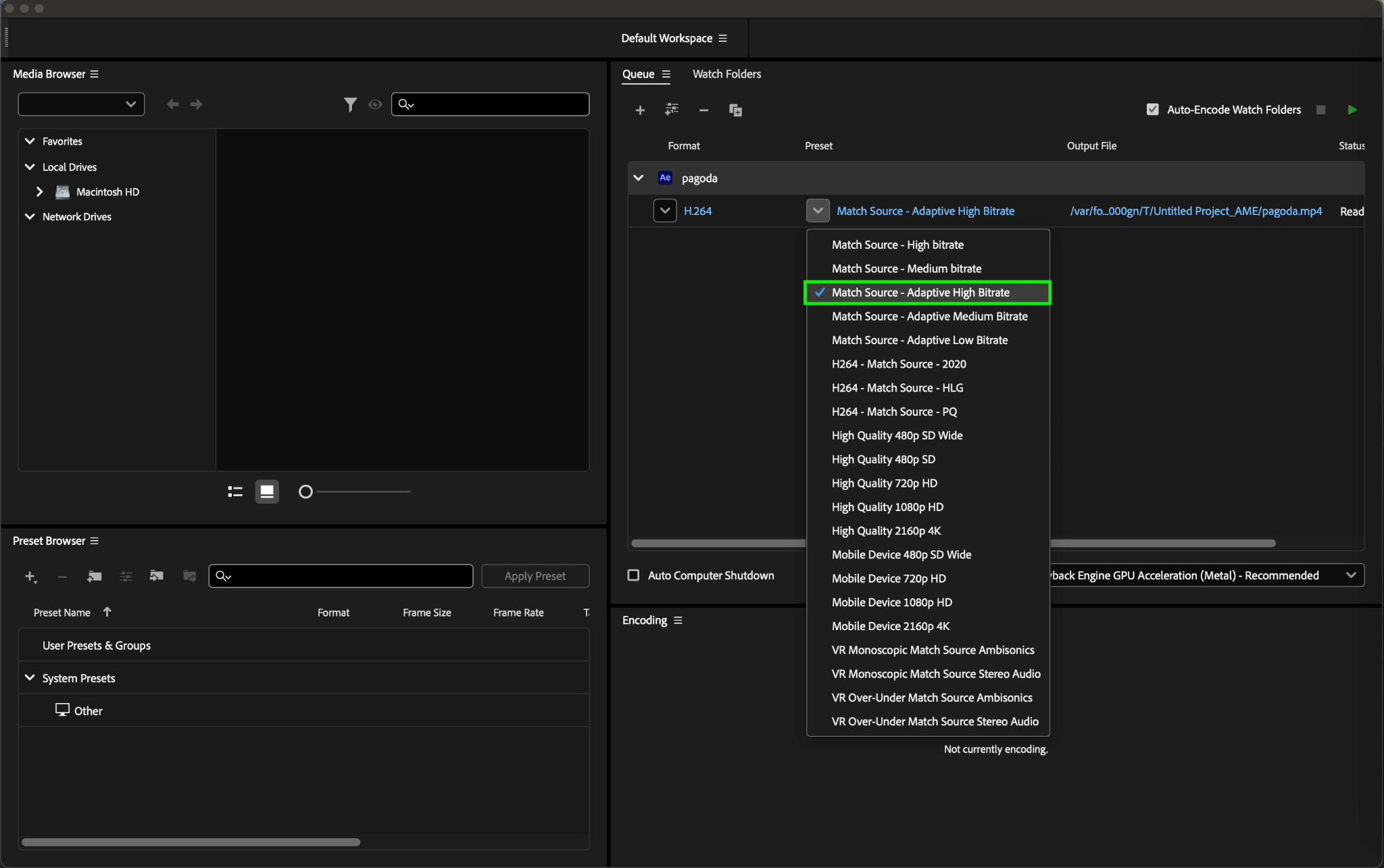In the Preset column, select Match Source – High Bitrate. This option will match the settings of your source video while optimizing for quality, resulting in a high-quality MP4 export.