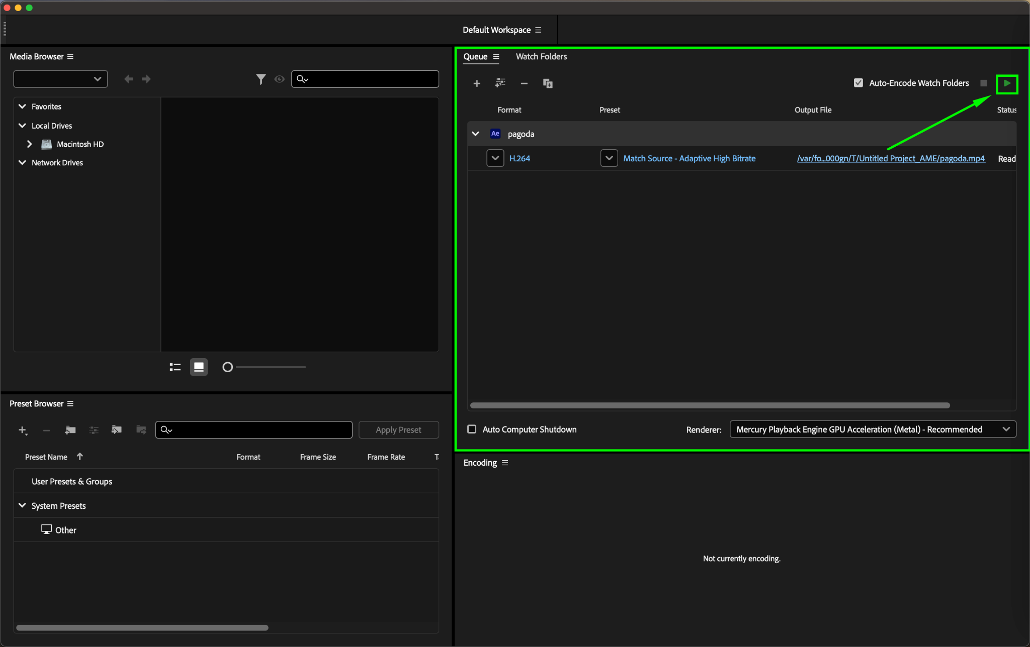 Once everything is set up, click on the Start Queue button in the top right corner of Adobe Media Encoder. The encoder will begin processing your project and exporting it as an MP4 file.