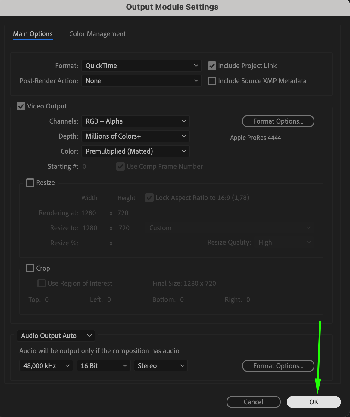 Adjust any other settings as needed to match your project requirements and click “OK” to apply the changes. This ensures that your video will be exported with the correct transparency settings.