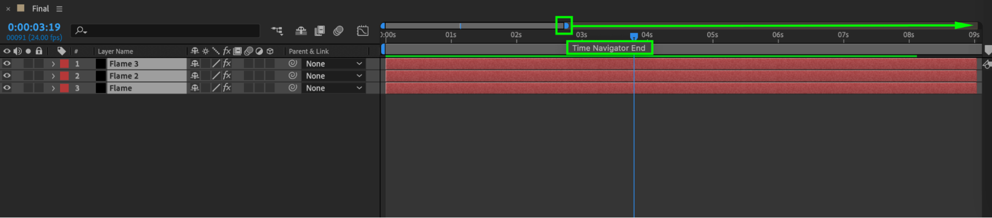 To accommodate the extended duration, move the time navigator end slider to the right. This action ensures that the composition’s timeline reflects the new duration accurately.