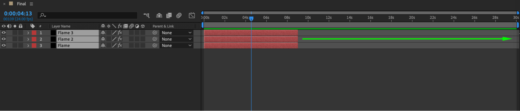 These actions ensure that your animations seamlessly continue throughout the extended duration, and additional elements can be incorporated into the composition as needed.