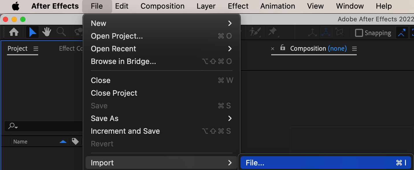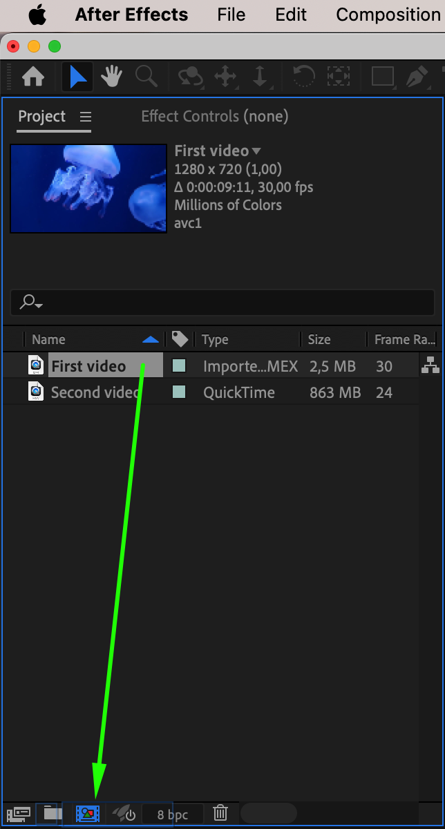 Drag the first video onto the “Project” panel and create a new composition by clicking “Create a New Composition.”