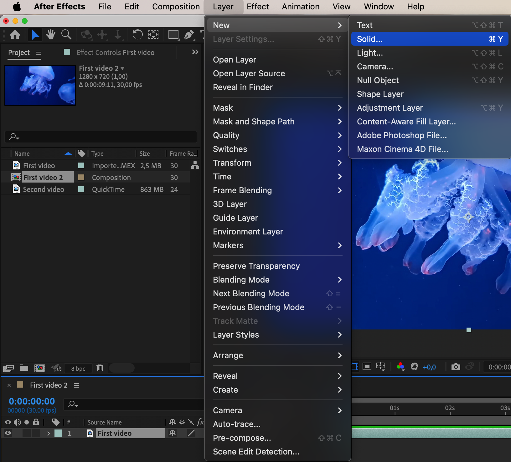 Go to “Layer” > “New” > “Solid” and create a black solid.