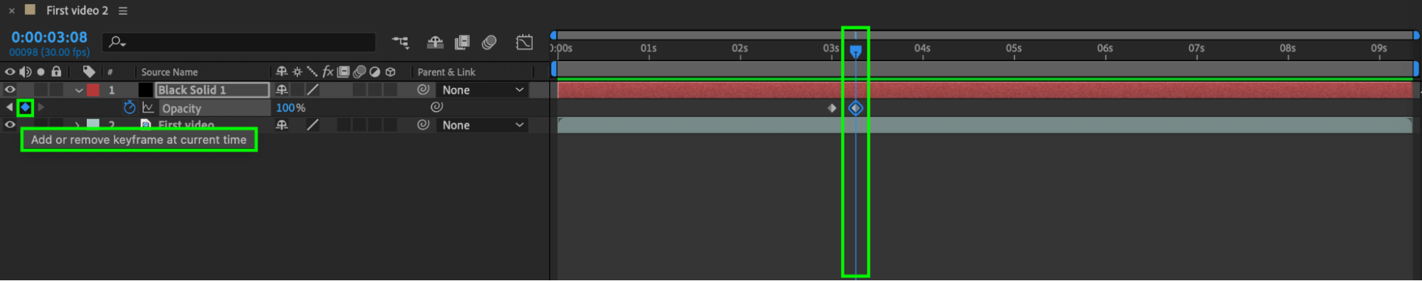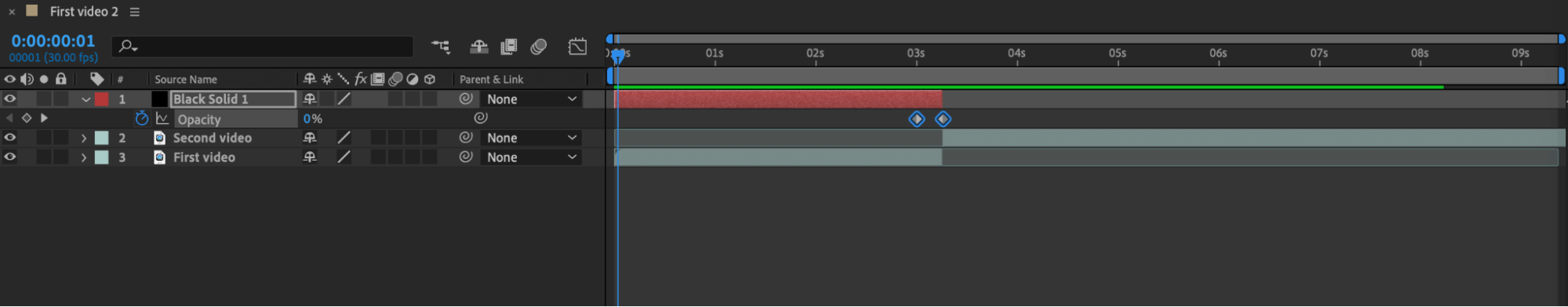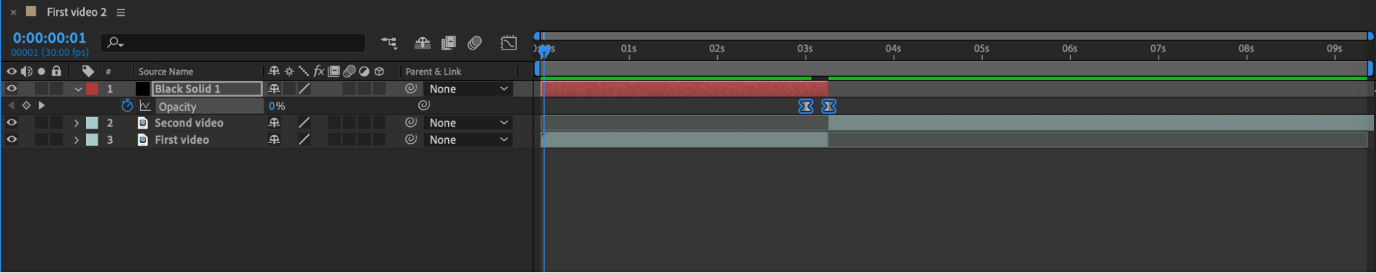 In the “Transform” section of the black solid layer, open the “Opacity” property or use the hotkey “T.” Then create two keyframes: one with a value of 0 at the beginning and the other with a value of 100 at the end of the first video. This can be done by moving the time indicator to the desired moments and setting the keyframes.