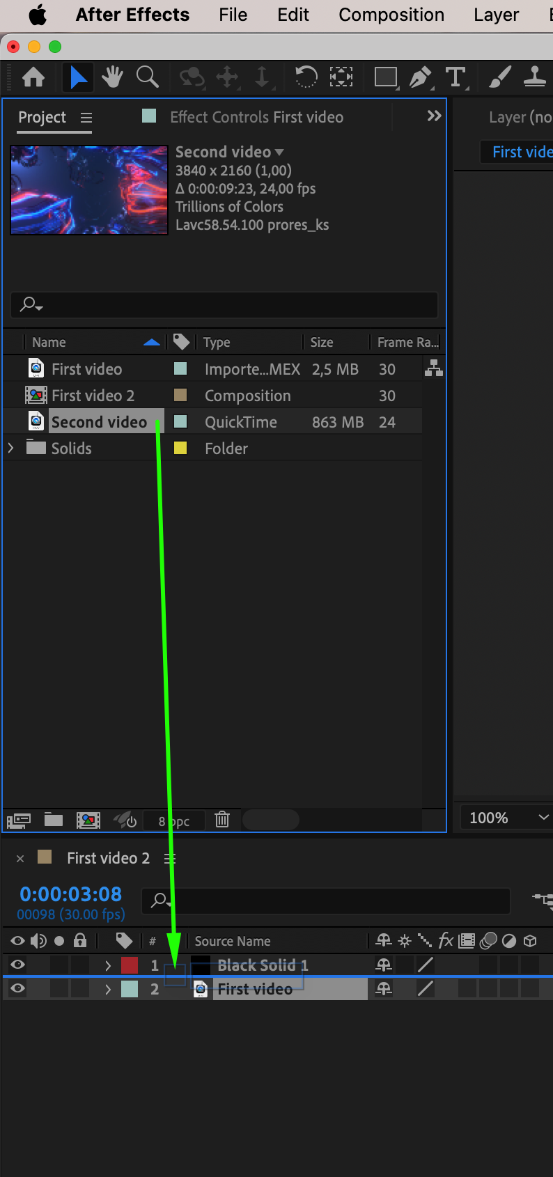 Drag the second video onto the project panel above the first one.