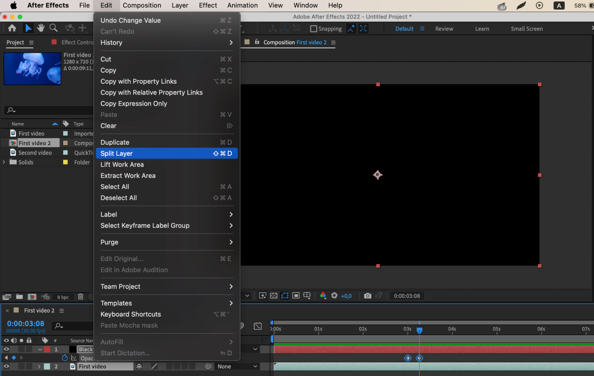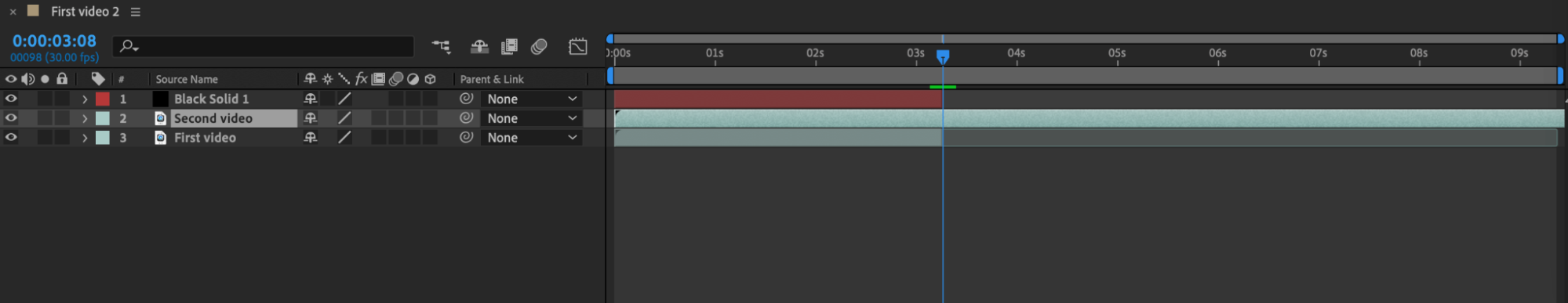 Keep the time indicator at the second keyframe, select the video layer and the black solid, then use “Edit” > “Split Layer” or the shortcut “Ctrl/Cmd + Shift + D” to split the layers and delete the trimmed parts.