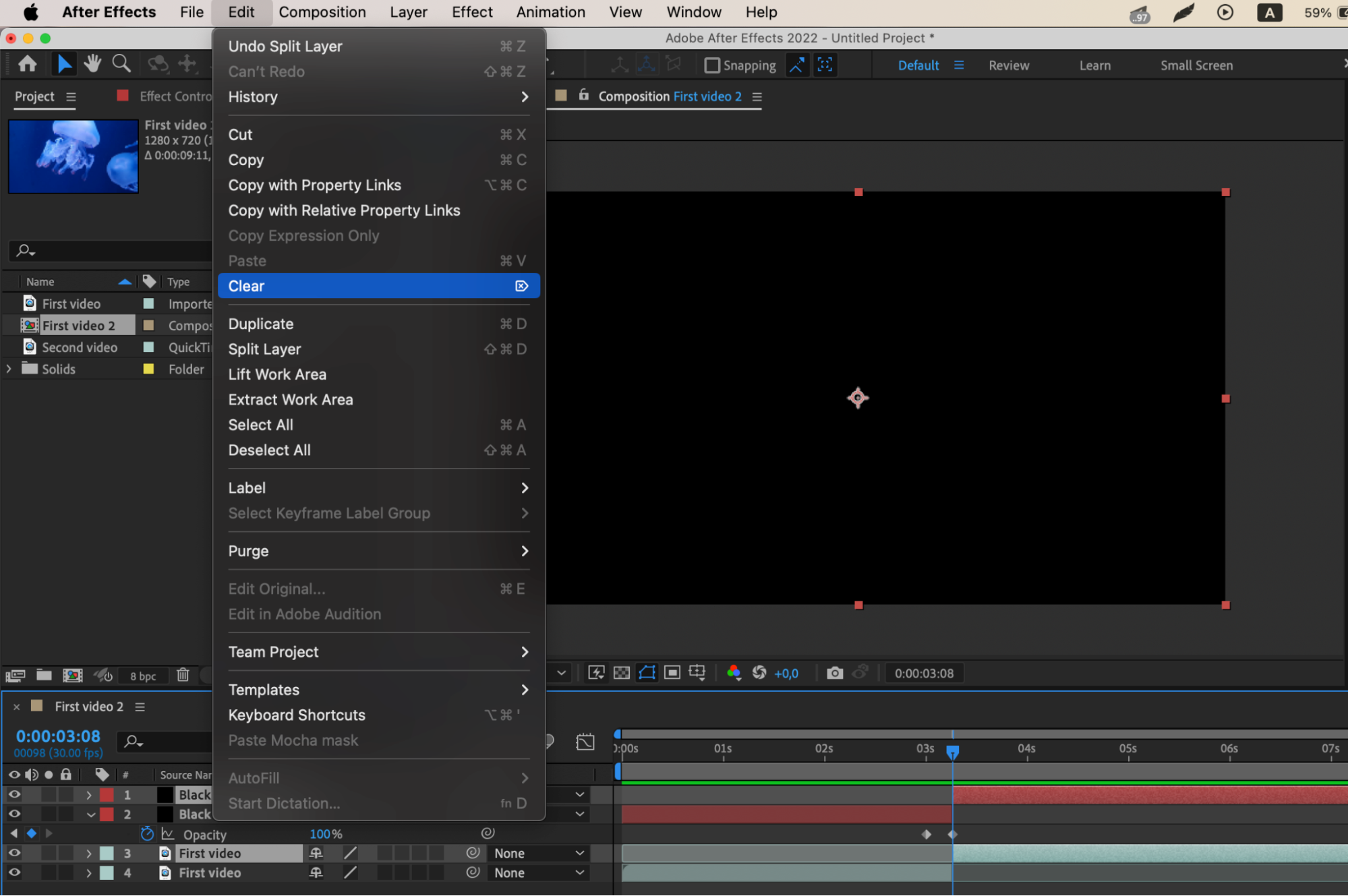 Steps to create a composition with a black transition between two videos: