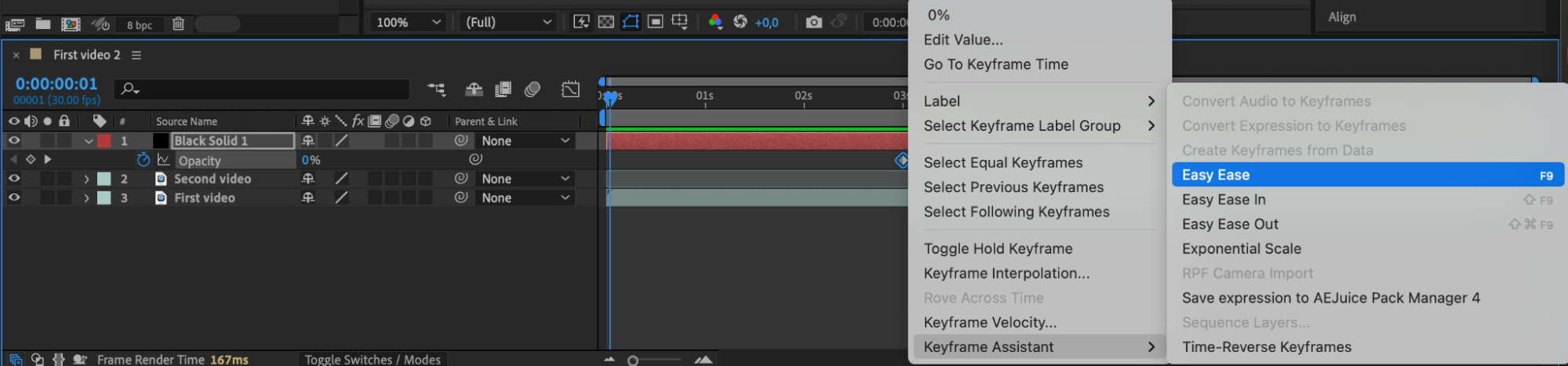 Select the black solid layer, press the “U” key to display the keyframes, select them, right-click, then choose “Keyframe Assistant” > “Easy Ease” to create a smooth transition between the videos.