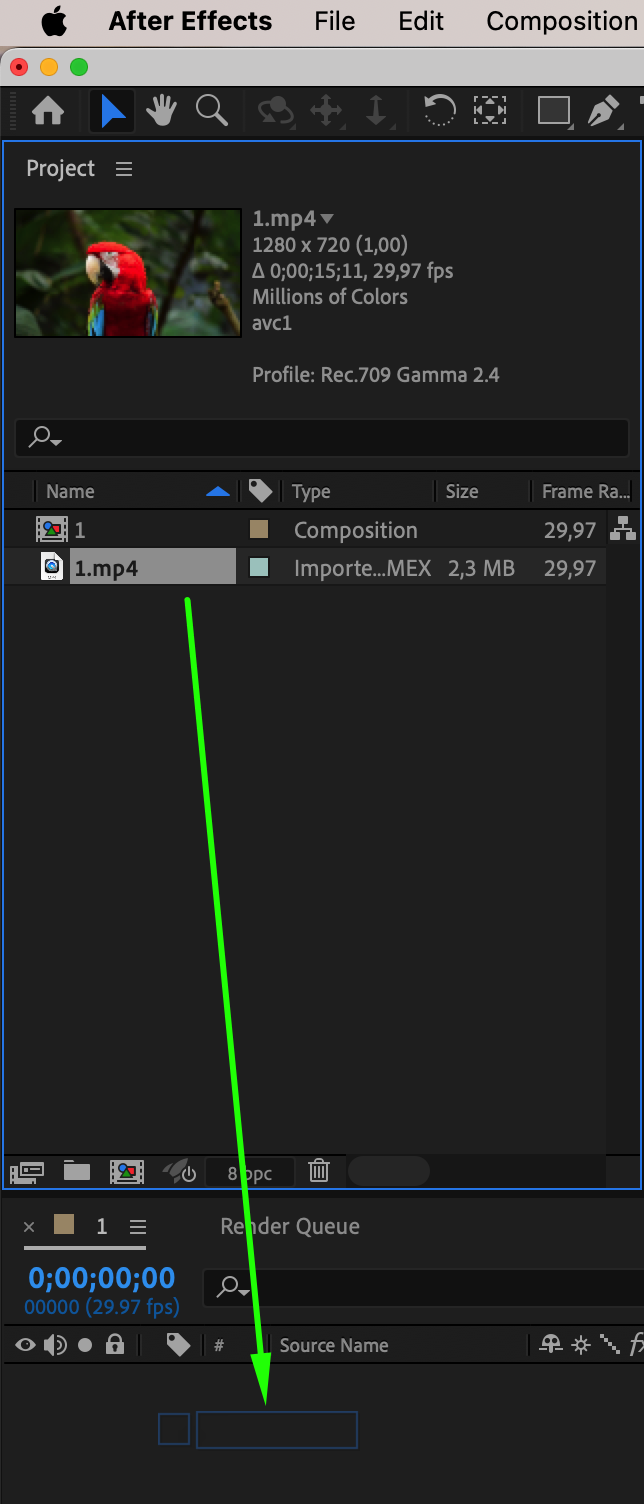 Drag your composition from the Project panel onto the timeline. This will add the video to the timeline for editing.