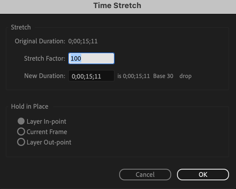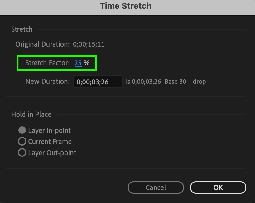 From the menu, select Layer > Time > Time Stretch. Enter the value by which you want to increase the speed, such as 50%, to double the video speed. Similarly, a smaller percentage will increase the video speed even further.