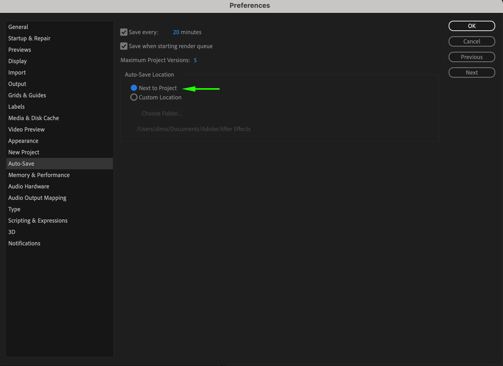 Within the Auto-Save preferences window, you’ll find the “Auto-Save Location” section. Here, you have two options: save auto-saves next to your project or choose a custom location on your computer. The location you select will determine where After Effects stores your auto-saved files. Regardless of the option you choose, the files will be saved in a folder named “Adobe After Effects Auto-Save,” making them easier to locate later on.