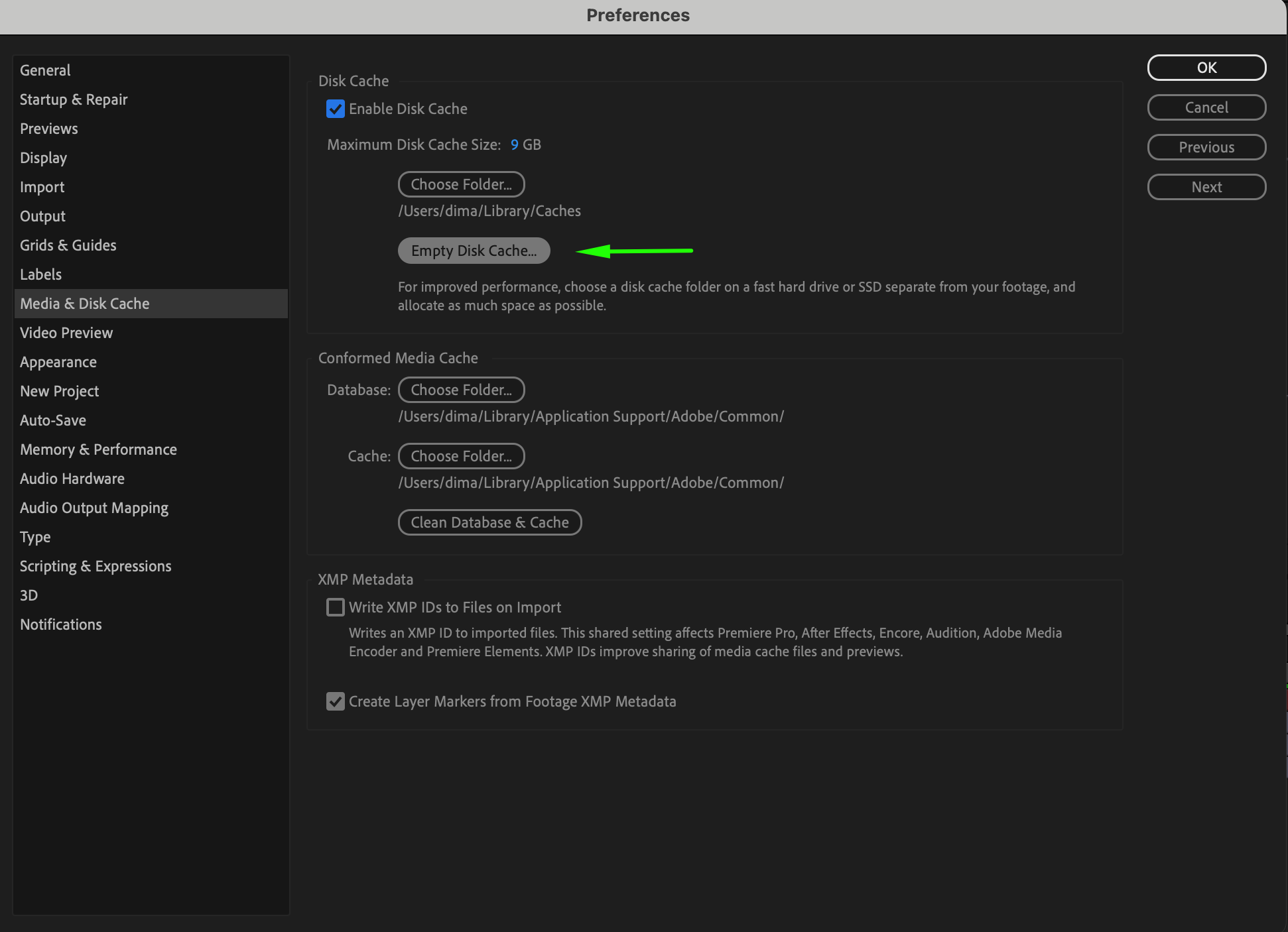 Since snapshots are stored temporarily, they will be lost when you close After Effects. If you need to clear them while working, go to Edit > Purge > All Memory & Disk Cache (Windows) or After Effects > Preferences > Media & Disk Cache (Mac). Then, click on Empty Disk Cache to remove all saved snapshots and free up memory.
