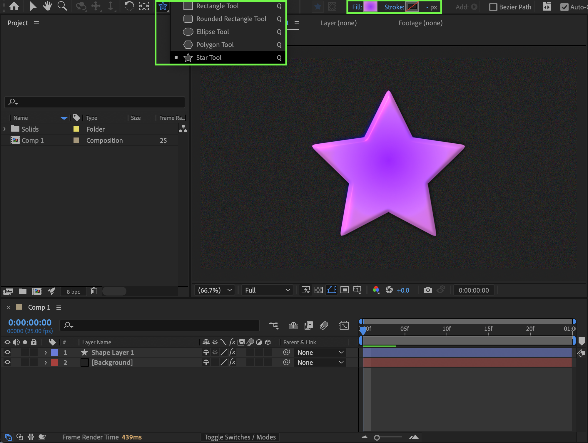 Select a Shape Tool (press Q) and create a shape in the composition. Set Fill and Stroke options as needed.
