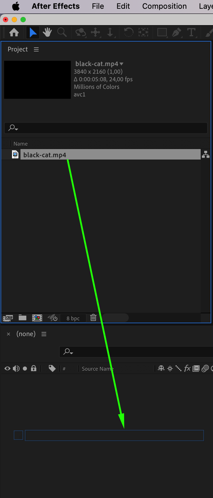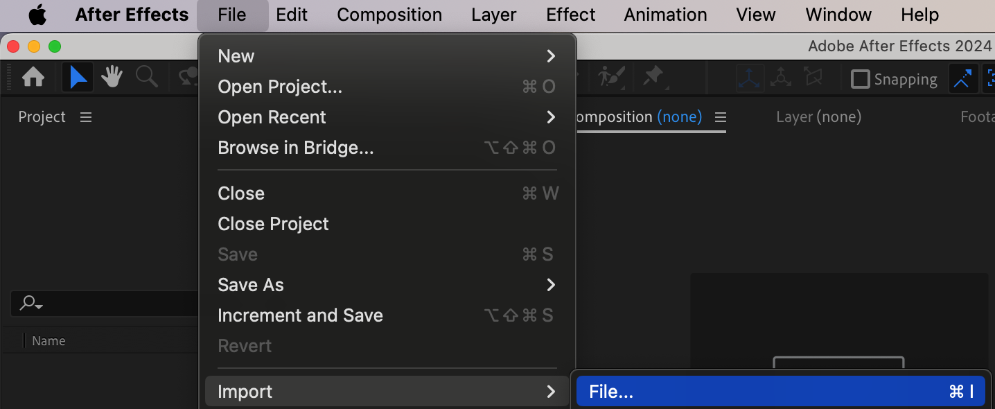 Begin by importing your media files. Go to File > Import > File, select the footage, image, or graphic you want to use, and click Open. Drag the imported file onto the timeline to add it to your composition.