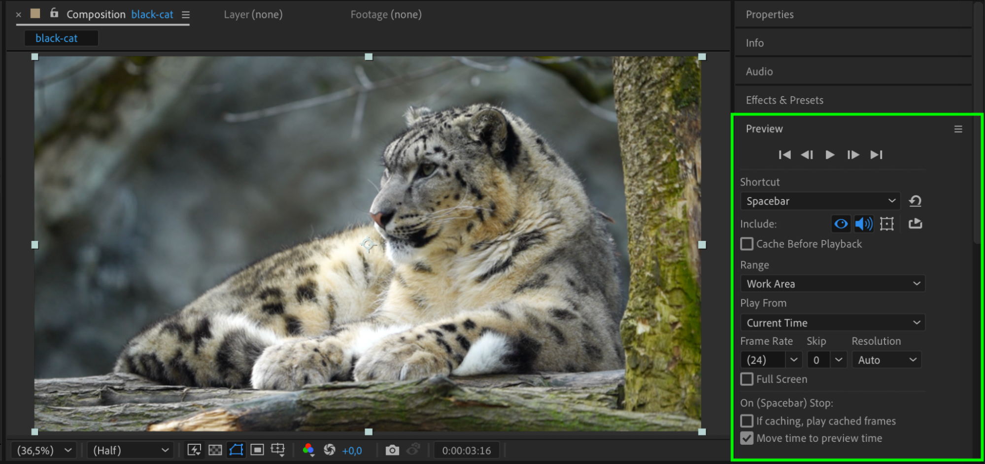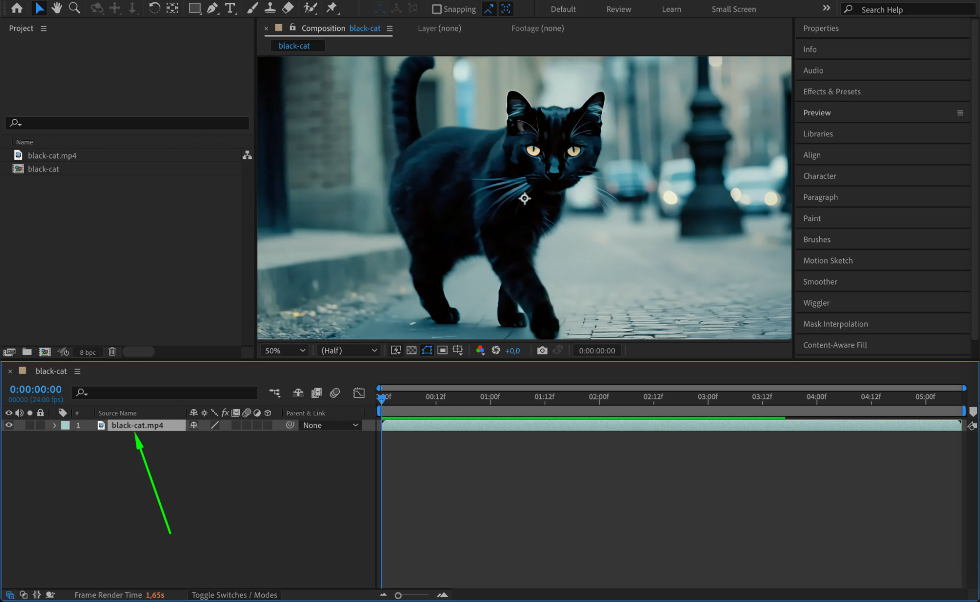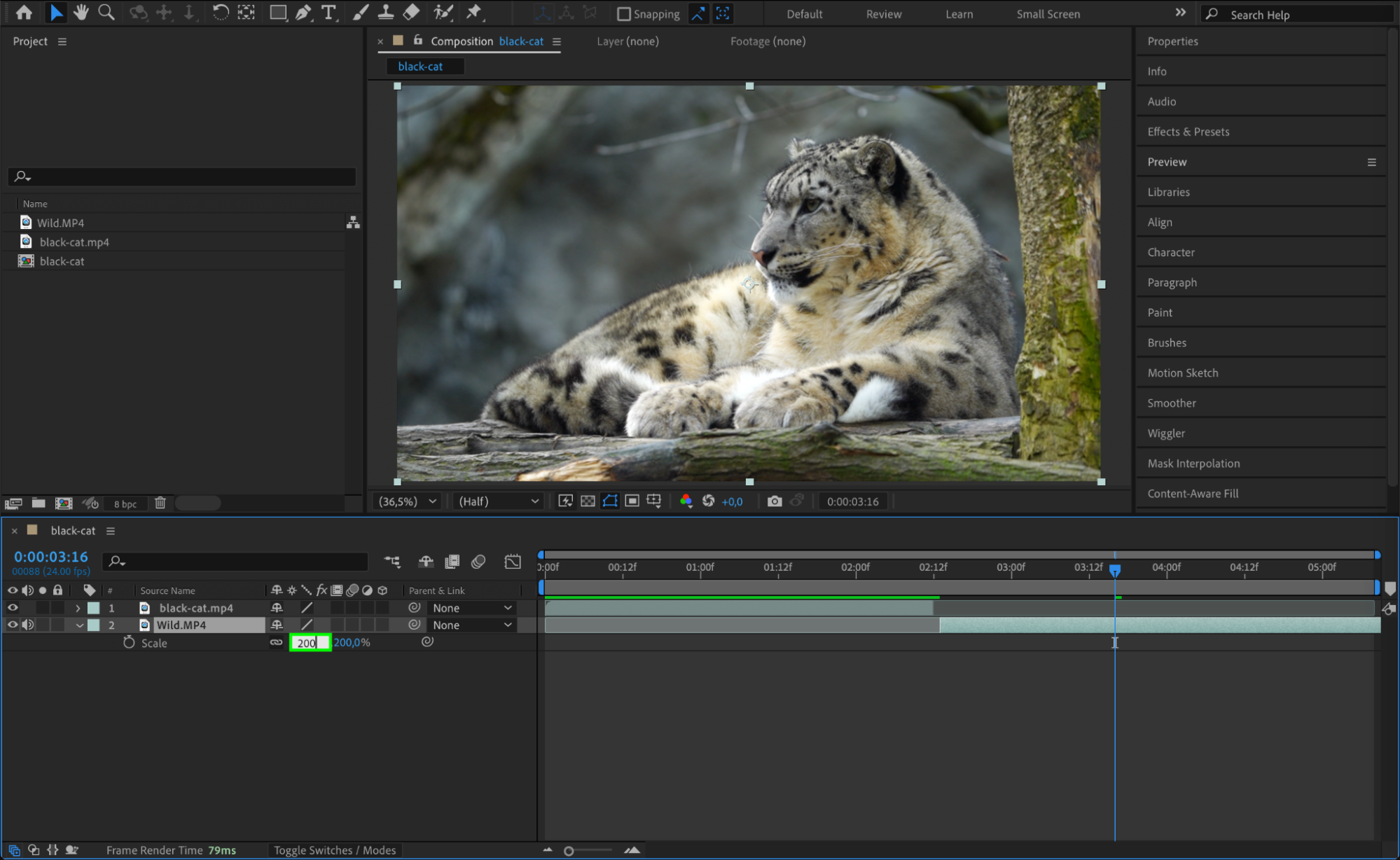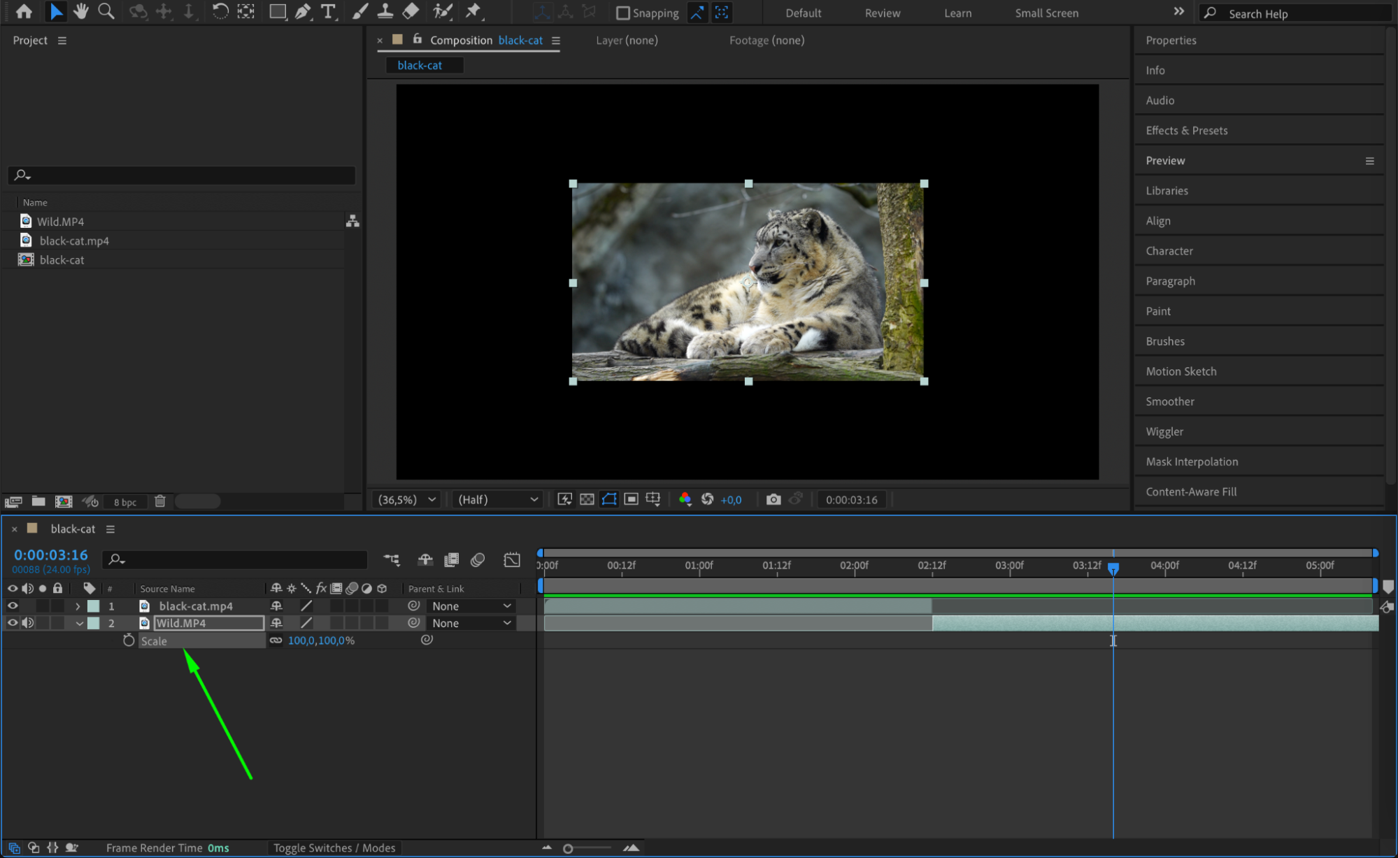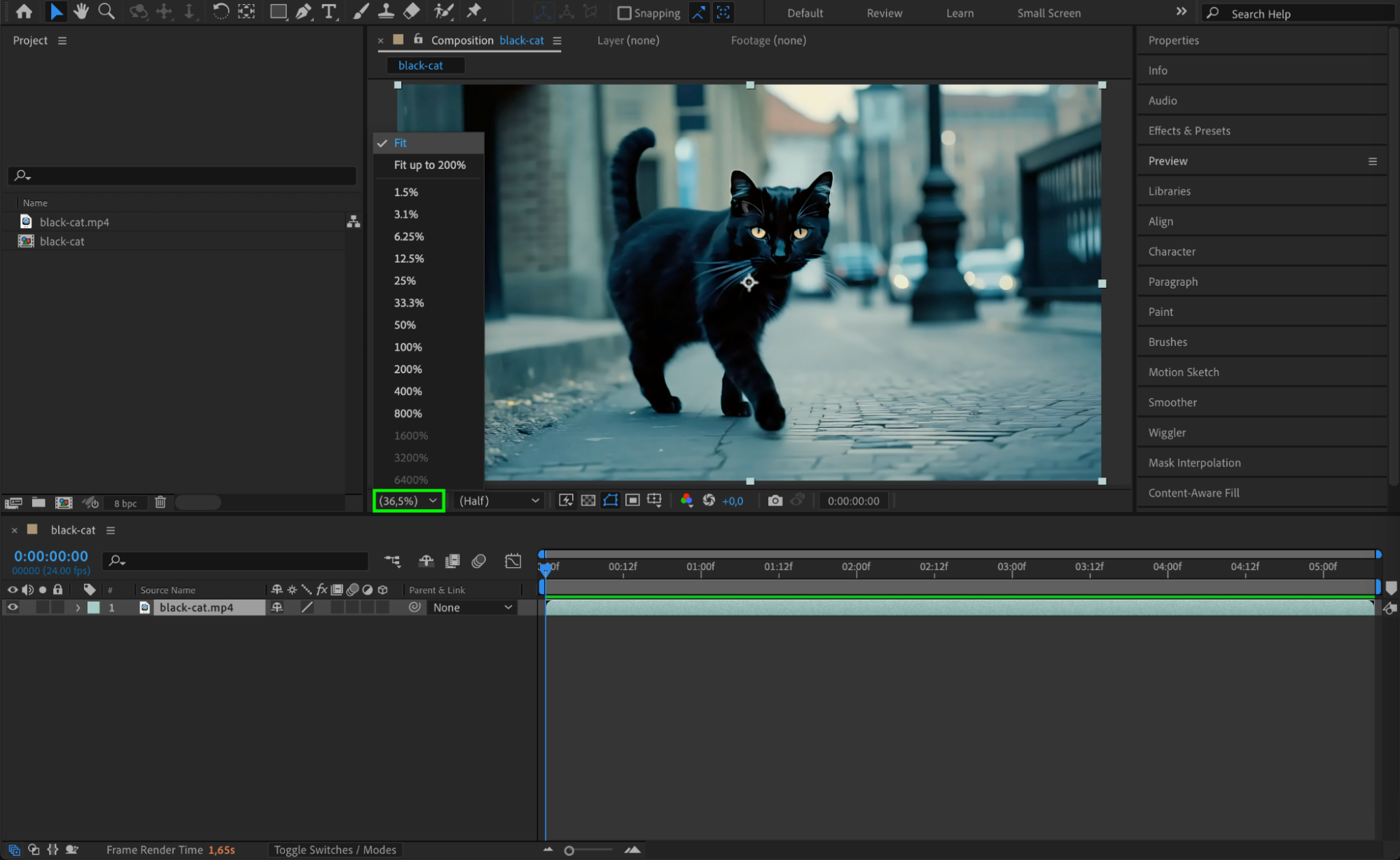 Press the spacebar to preview your composition. Ensure that the fitted layer looks balanced and that no crucial parts are cropped. If needed, reposition the layer by pressing “P” to access the Position property.