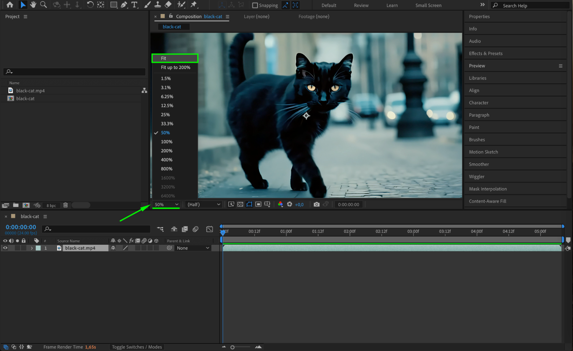 ook at the bottom left of the Composition Panel. You will find a dropdown menu displaying the current zoom percentage (e.g., 50%, 100%). Click on the dropdown and select Fit from the options. This action ensures the composition view adjusts to fit your screen size, making it easier to work on your project.