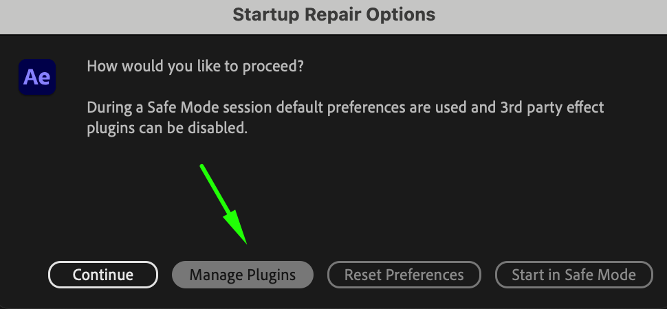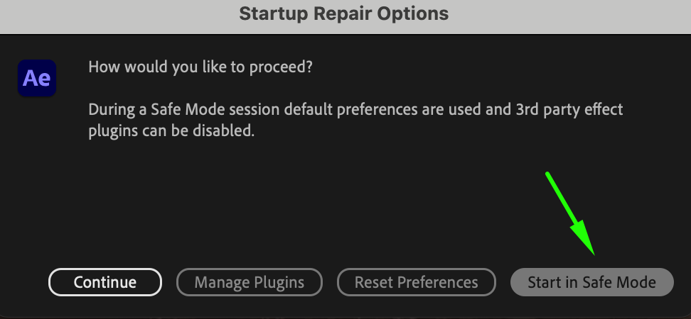 Sometimes, third-party plugins can trigger the “Unbalanced Unlock” error. After Effects allows you to temporarily disable plugins by starting the software in Safe Mode.