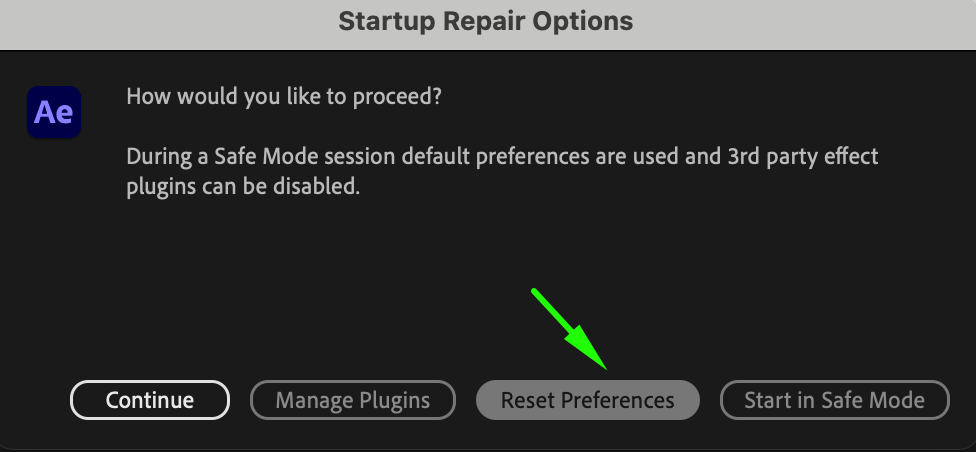 This will clear custom settings, workspace layouts, and preferences. Don’t worry, this won’t delete any projects or plugins, but you’ll need to reconfigure After Effects after the reset.