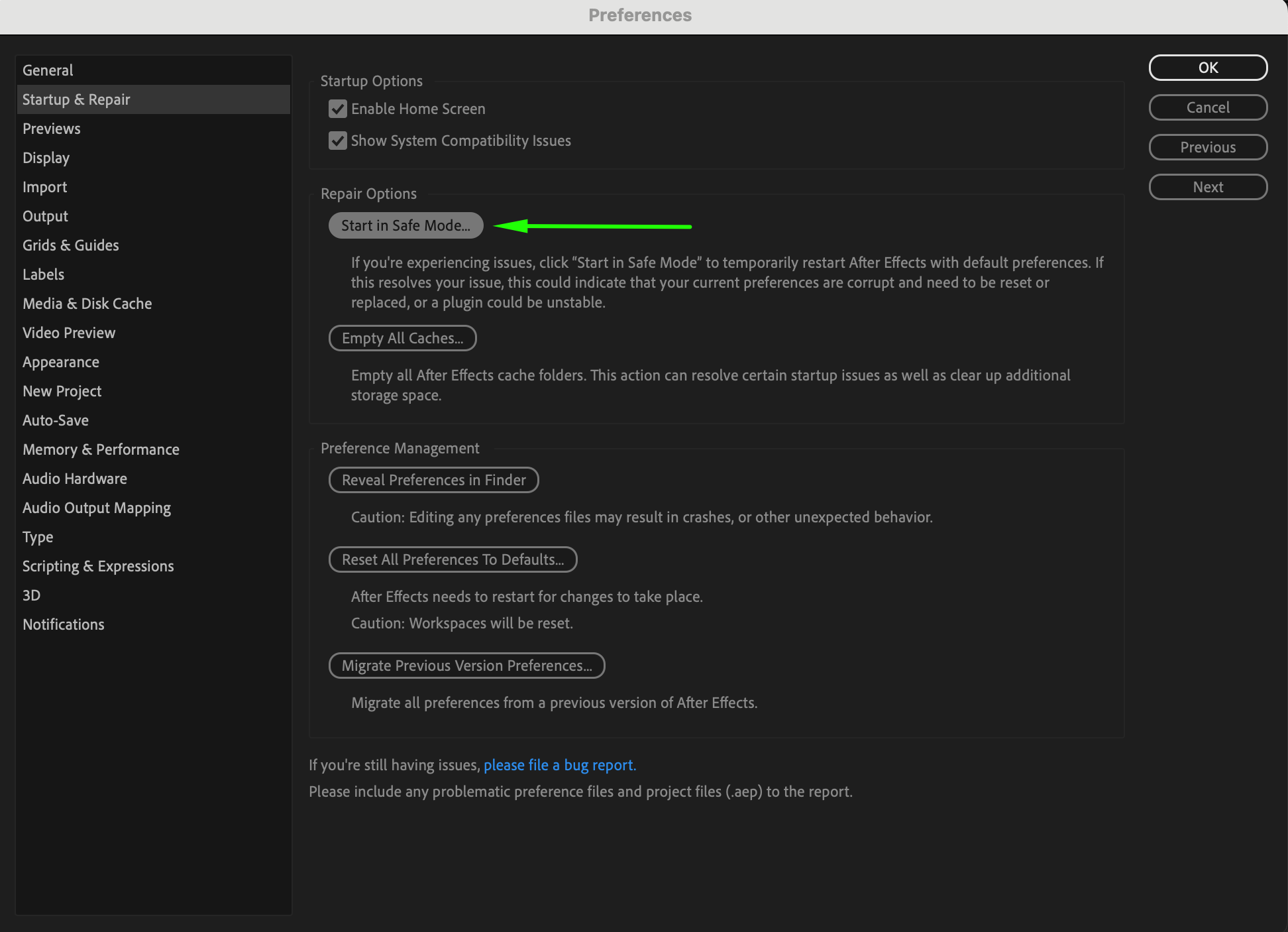 Corrupt preferences can lead to unexpected errors. To reset them, go to Edit > Preferences > Startup & Repair (Windows) or After Effects > Settings > Startup & Repair (Mac). Click the Reset All Preferences to Default button. This will restore After Effects to its default settings, potentially fixing any issues caused by corrupted preferences.
