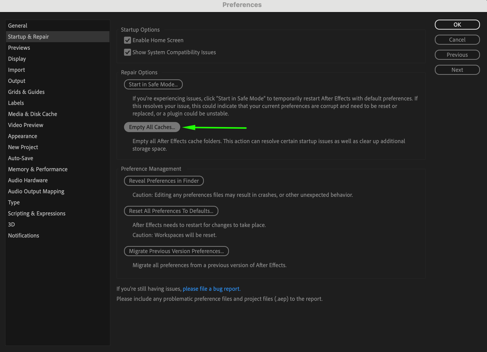 Clearing the cache can help free up memory and improve performance. Navigate to Edit > Preferences > Startup & Repair (Windows) or After Effects > Settings > Startup & Repair (Mac). Click the Empty All Caches button, then restart After Effects to apply the changes.