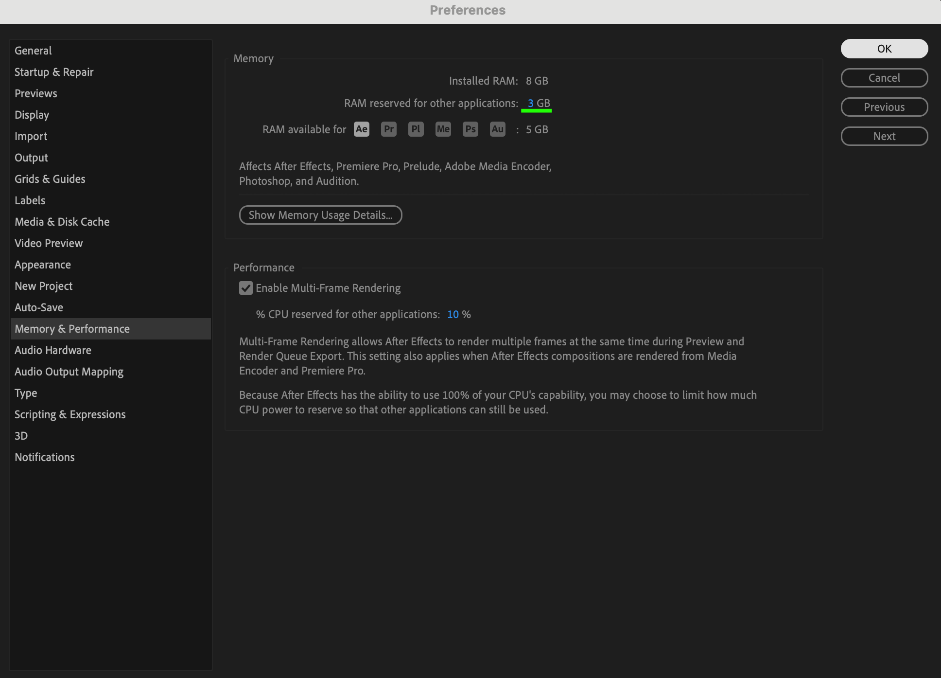 If After Effects lacks sufficient RAM, it may cause instability. Increase RAM allocation via Edit > Preferences > Memory & Performance (Windows) or After Effects > Settings > Memory & Performance (Mac) and adjust the available RAM for AE.