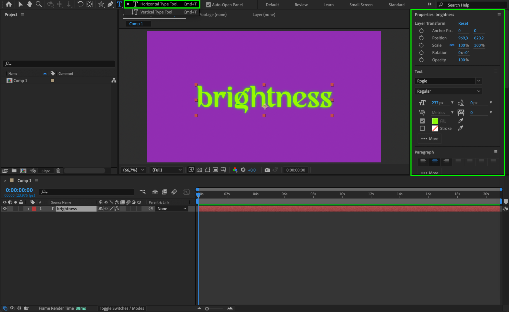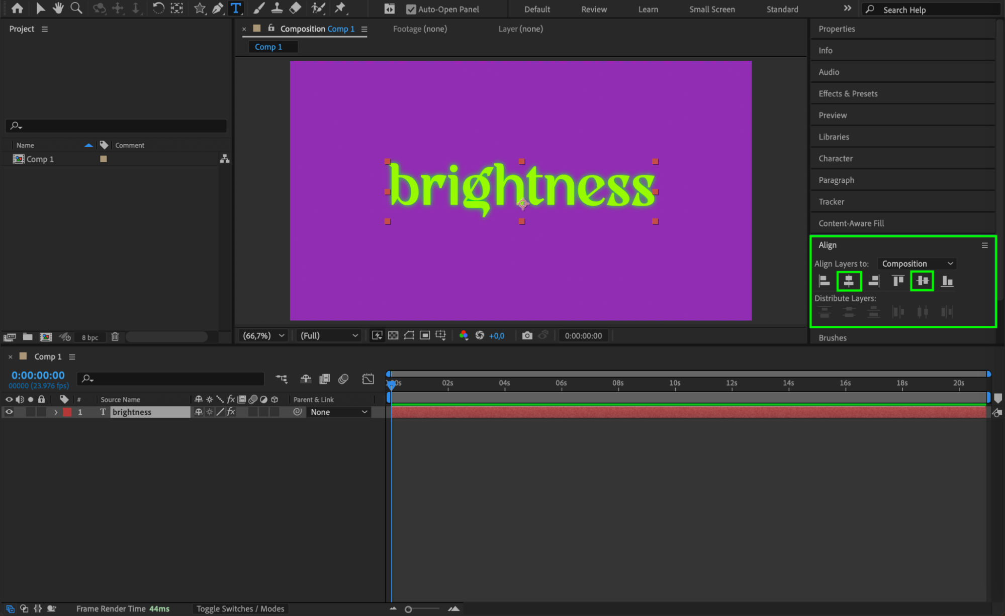 To ensure the text is perfectly centered, use the Align panel. Click on Align Horizontally and Align Vertically to place the text in the middle of the composition.