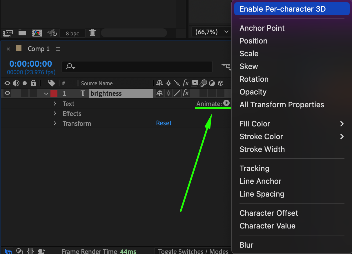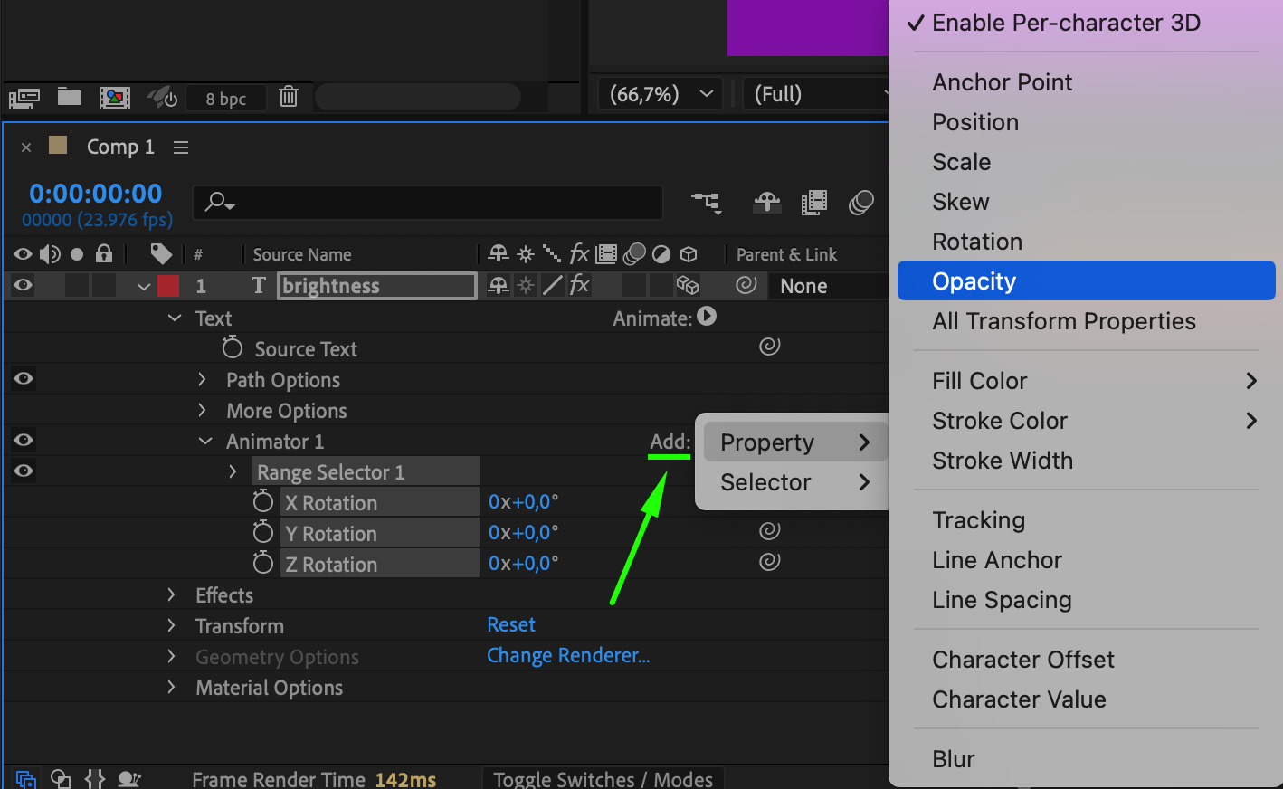 Next to Animator 1, click the Add button, then go to Property > Opacity. This step helps create a smooth transition effect by fading in the flipped text.