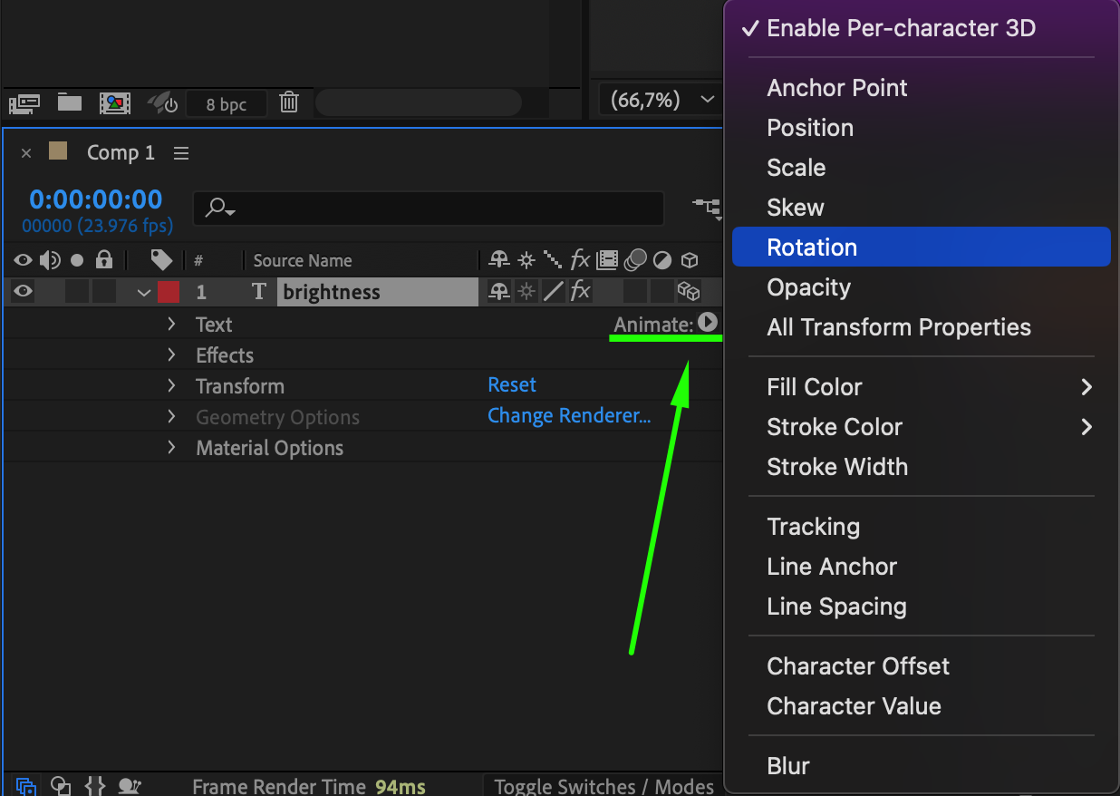 Expand the text layer properties again. Click on Animate and select Rotation. This will allow you to animate the text flip effect.