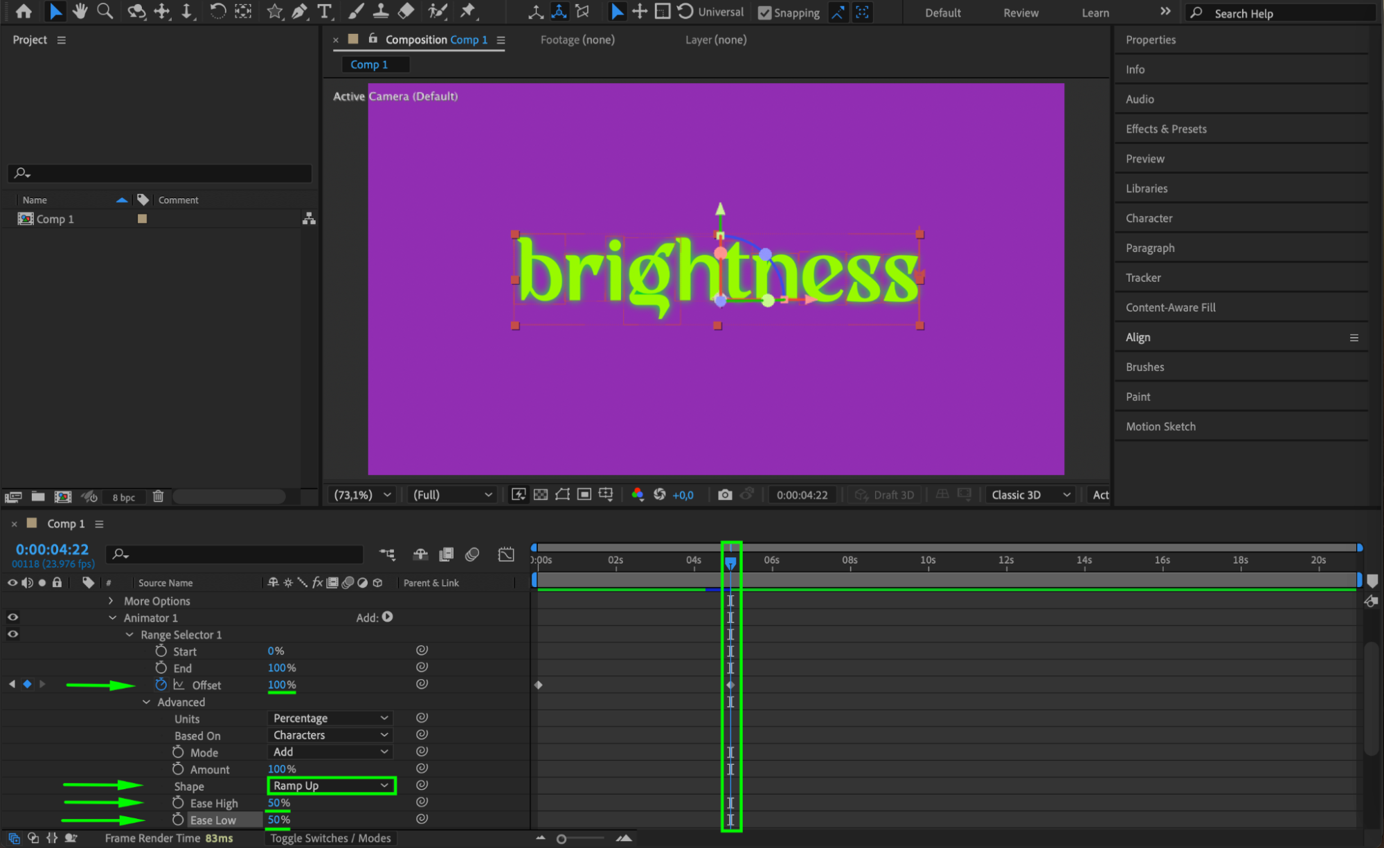 Move the CTI (Current Time Indicator) forward in the timeline. Then, adjust the Offset to 100% and set the Shape to Ramp Up.