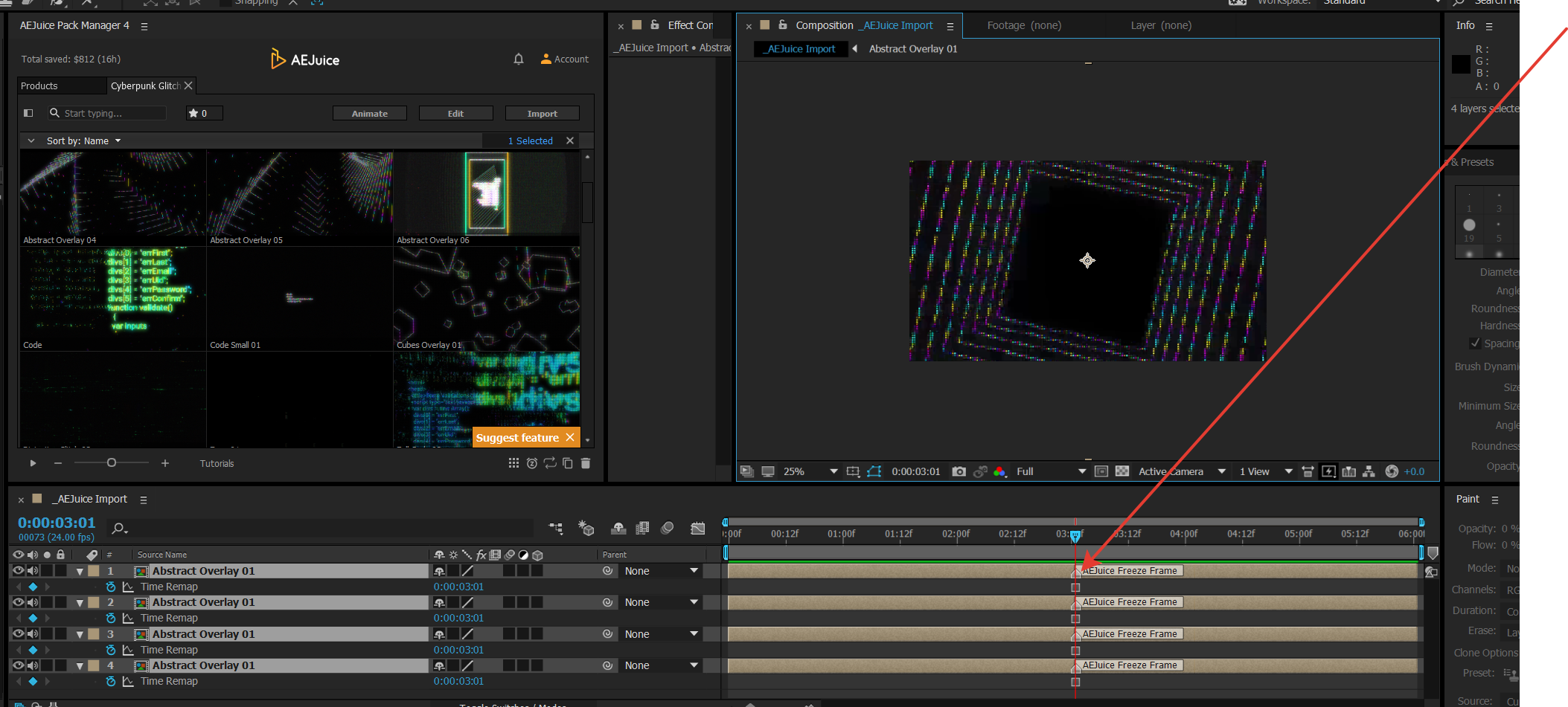 Freeze frame freezes 1 frame from the video. You might need it for editing purposes or to speed up your workflow. While you’re working with a few layers you might freeze frame the rest.