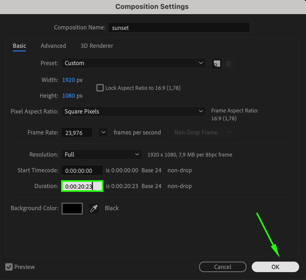 In the Composition Settings window, increase the Duration to add time for the frozen frame. For example, if your video is 17 seconds long, extend the duration to 20 seconds to create a 3-second freeze at the end. Click OK to apply the changes.