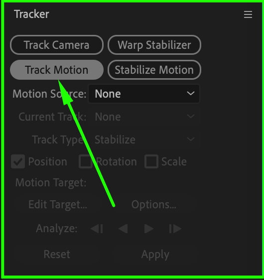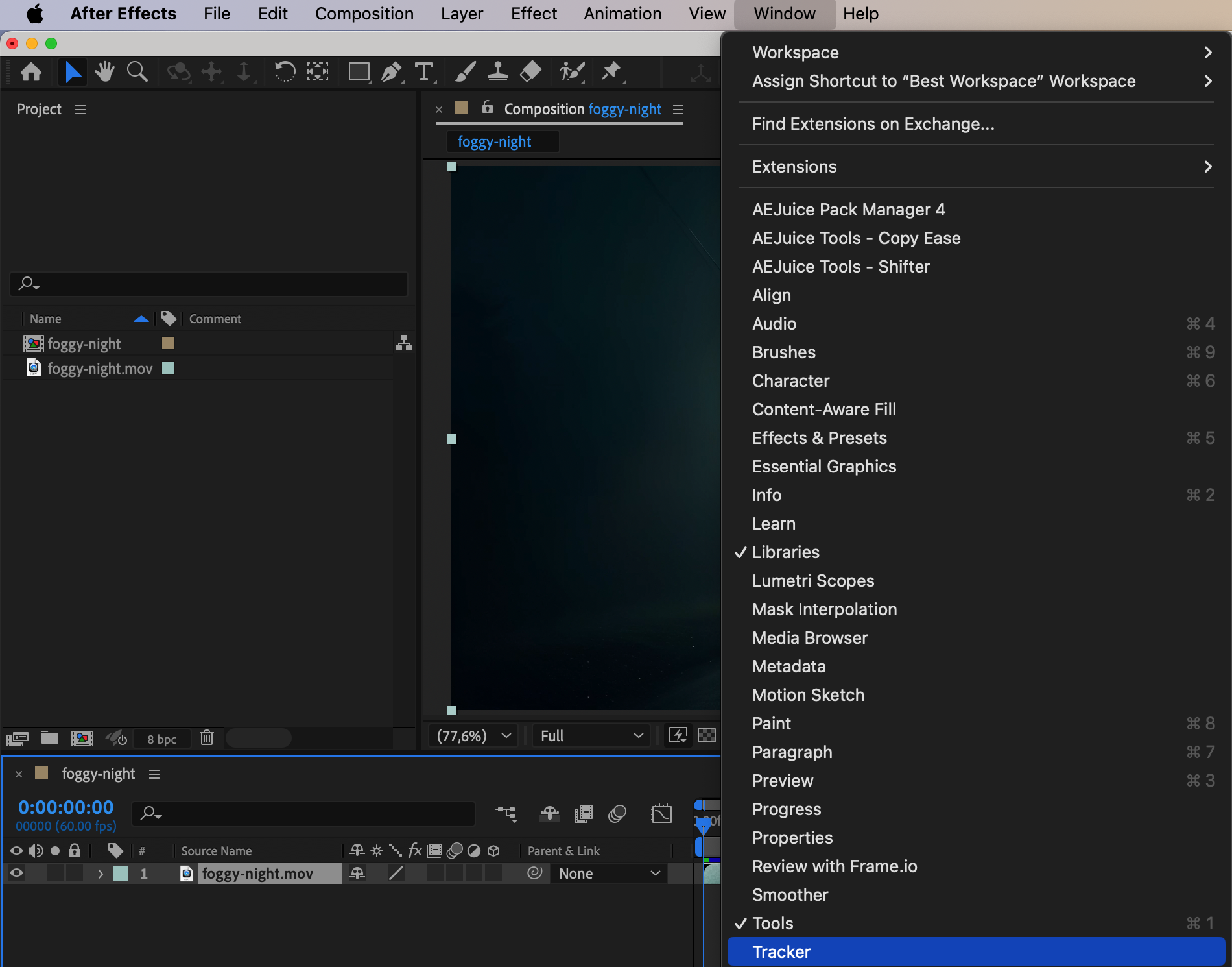 Go to Window > Tracker to open the Tracker panel. With your footage layer selected, click Track Motion. This will open the layer in a new layer viewer window and place a track point on the screen.