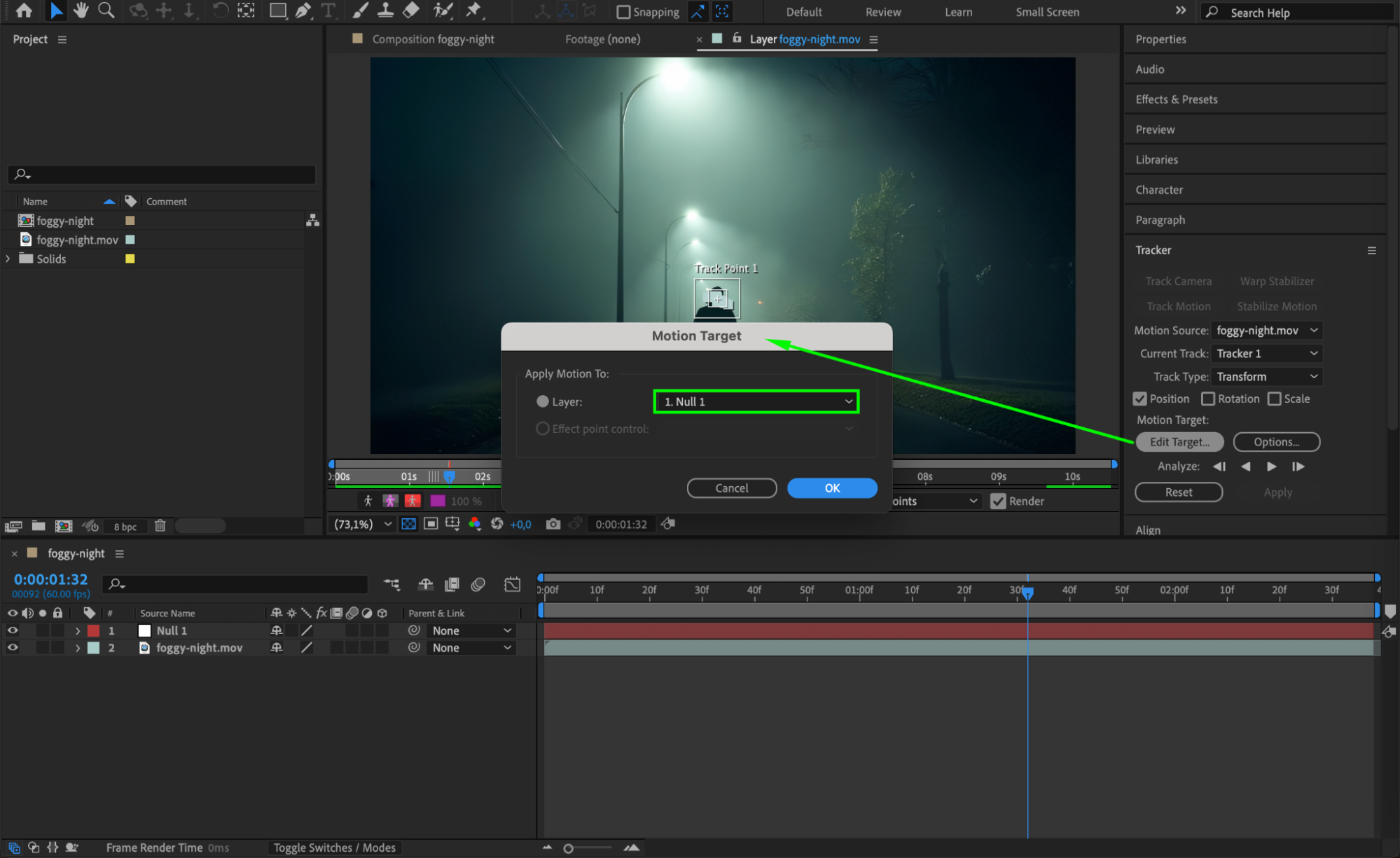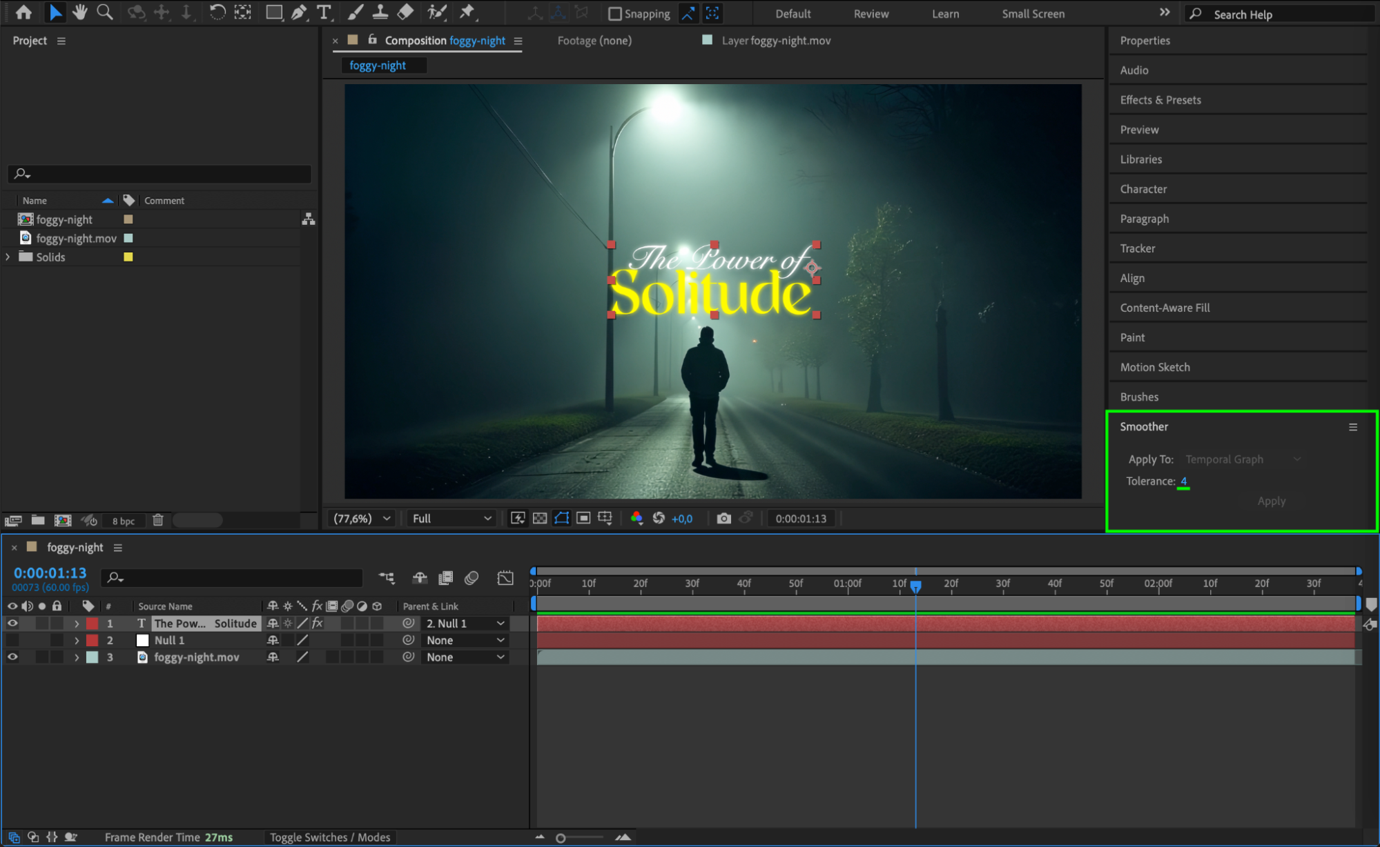 If the motion feels too jittery, you can smooth it. Select the null layer, press “U” to reveal keyframes, and apply the Smoother tool (Window > Smoother) or use Keyframe Interpolation to ease motion. You can also apply expressions like smooth() to reduce noise.
