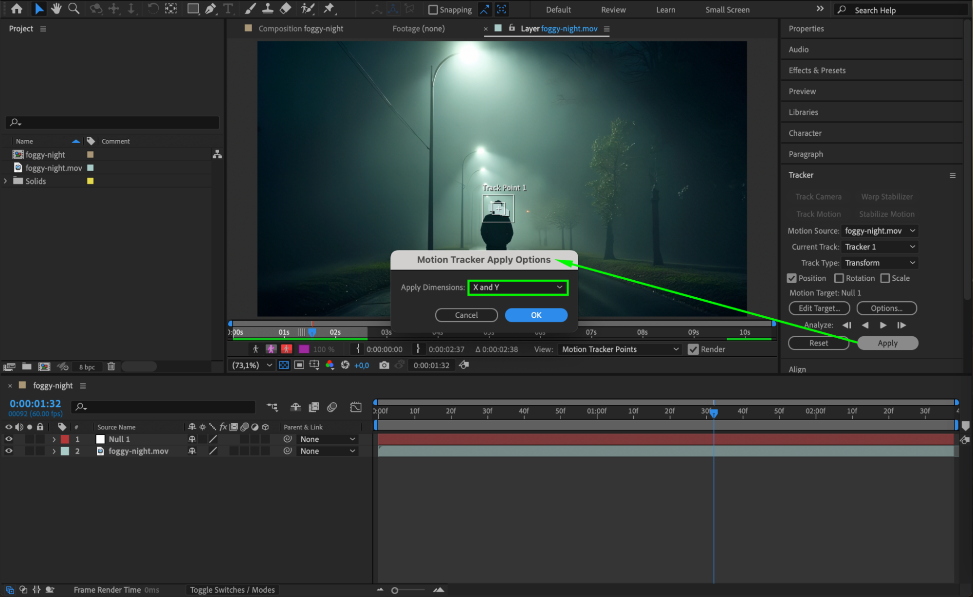 Create a new Null Object (Layer > New > Null Object). In the Tracker panel, click Edit Target, select the Null Object, then click Apply. Choose X and Y dimensions to transfer the tracking data. Now the null object follows the motion accurately.