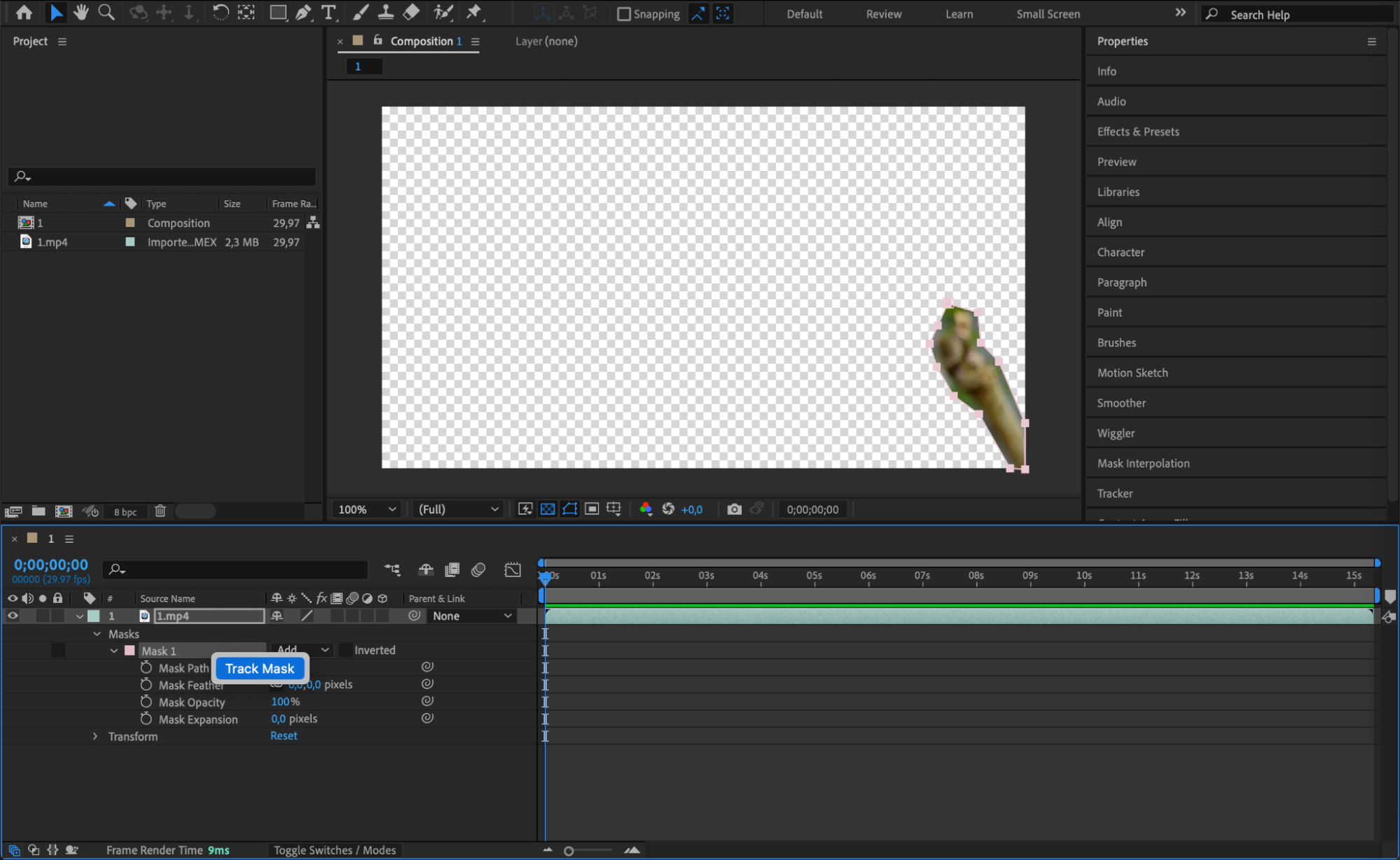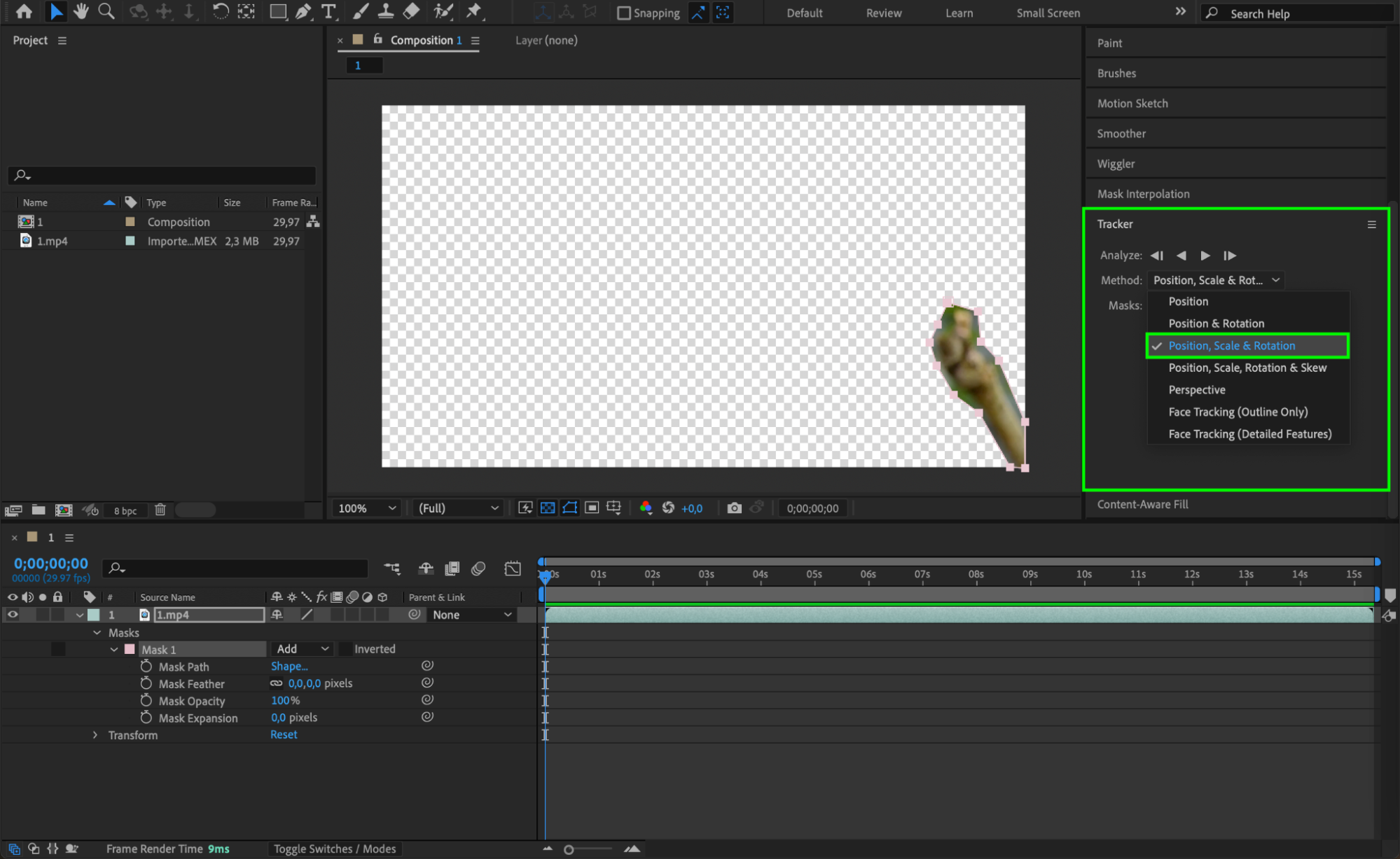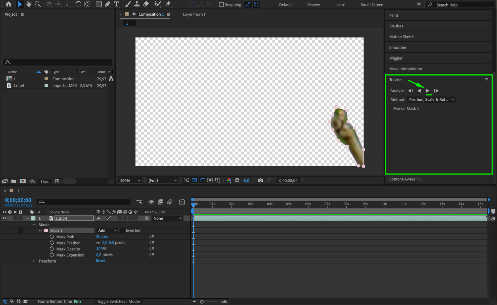 Next, expand the properties of your video layer by clicking the arrow next to it. Locate the “Masks” section and right-click on “Mask 1,” then select “Track Mask” from the submenu. This will open the Tracker panel, where you can choose the appropriate tracking method. Click the “Play” button in the “Analyze” section to begin tracking the mask. This process ensures that the mask follows the object throughout the entire duration of the clip.