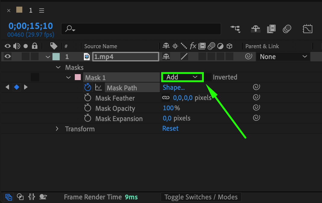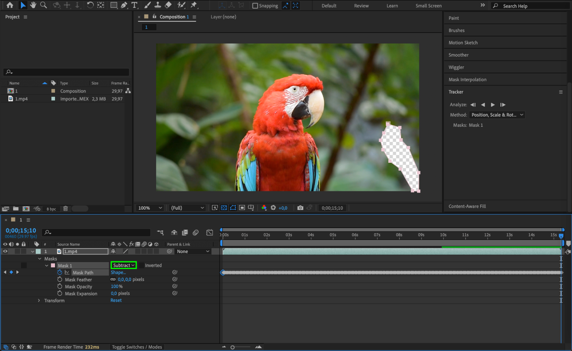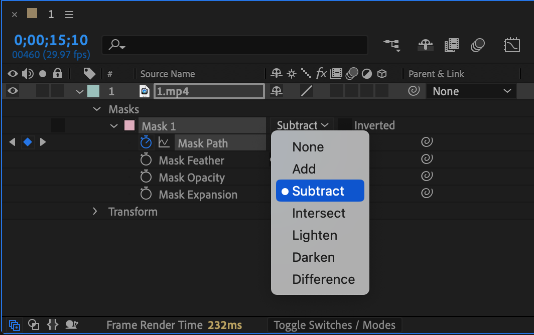 After reviewing the mask keyframes, it’s time to prepare for the Content Aware Fill process. Under your video layer, locate the “Masks” section again and find the “Add” button next to “Mask 1.” Click on it and select “Subtract” from the dropdown menu. This action will invert the mask, allowing After Effects to remove the selected area from the footage rather than keeping it.