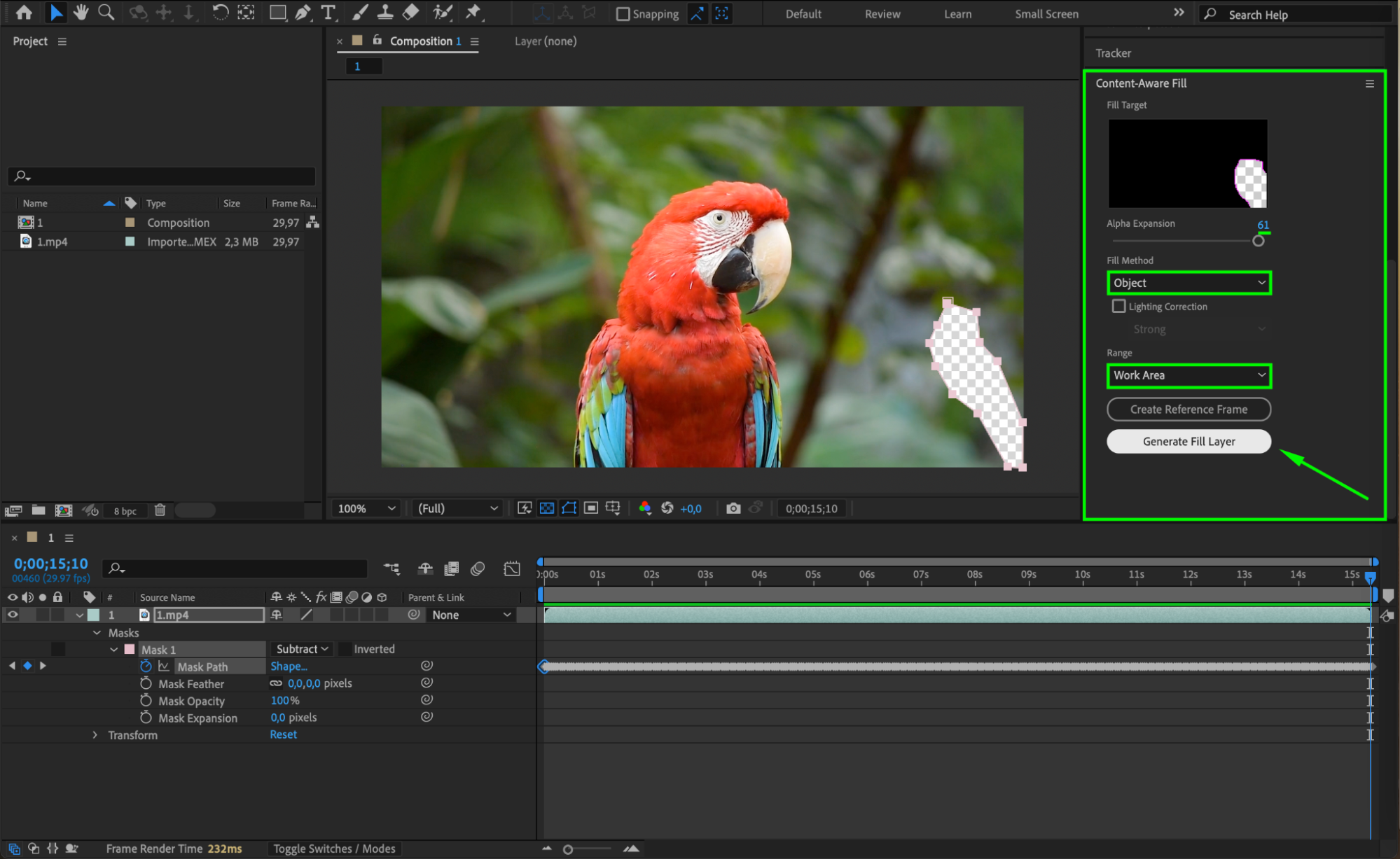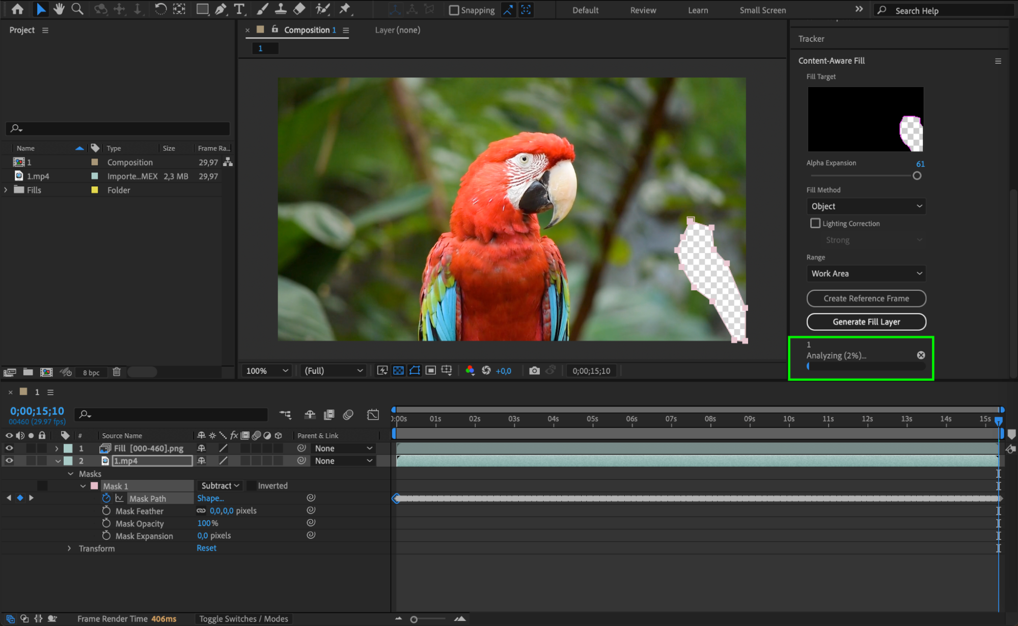 After you’ve clicked “Generate Fill Layer,” After Effects will analyze the masked area and create a new fill layer that removes the unwanted object. This process may take some time, depending on the complexity of the scene and your computer’s processing power. Once the fill layer is generated, preview your composition to ensure that the object has been removed seamlessly and that the fill matches the surrounding footage.