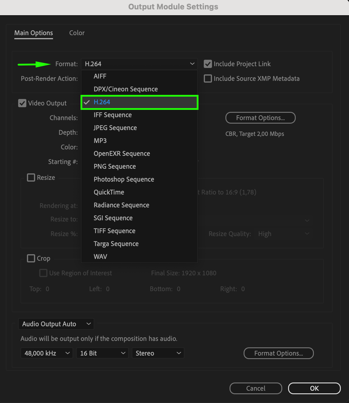Audio Output: If your composition includes audio, make sure to select the appropriate codec and configure the audio settings. If there’s no audio in your project, you can disable this option.
