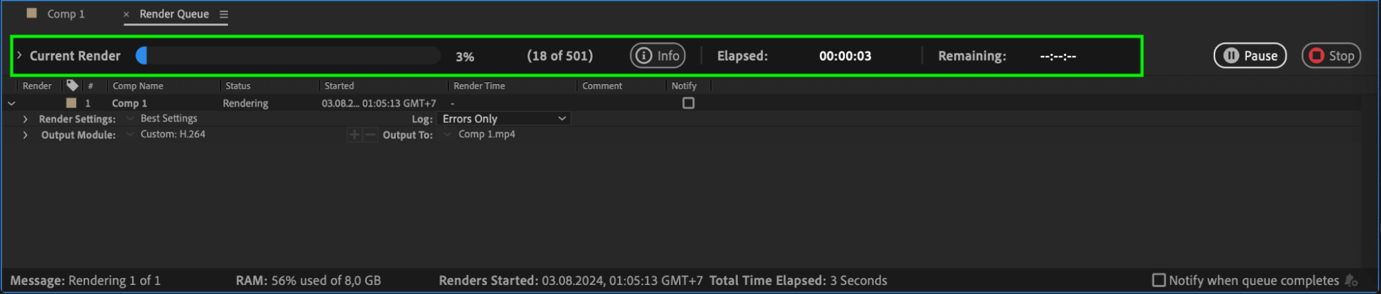 As After Effects renders your composition, you can monitor the progress in the Render Queue panel. This will show you a status bar indicating how much of the rendering process is complete. It’s important to be patient during this step, especially if your composition contains a lot of layers, effects, or high-resolution footage.