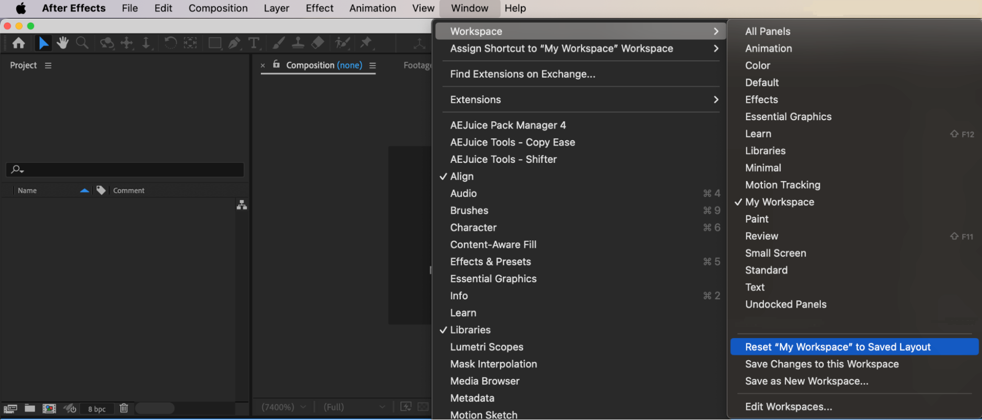 If none of the above methods work, close After Effects and restart it. This can refresh the workspace and restore any missing panels.
