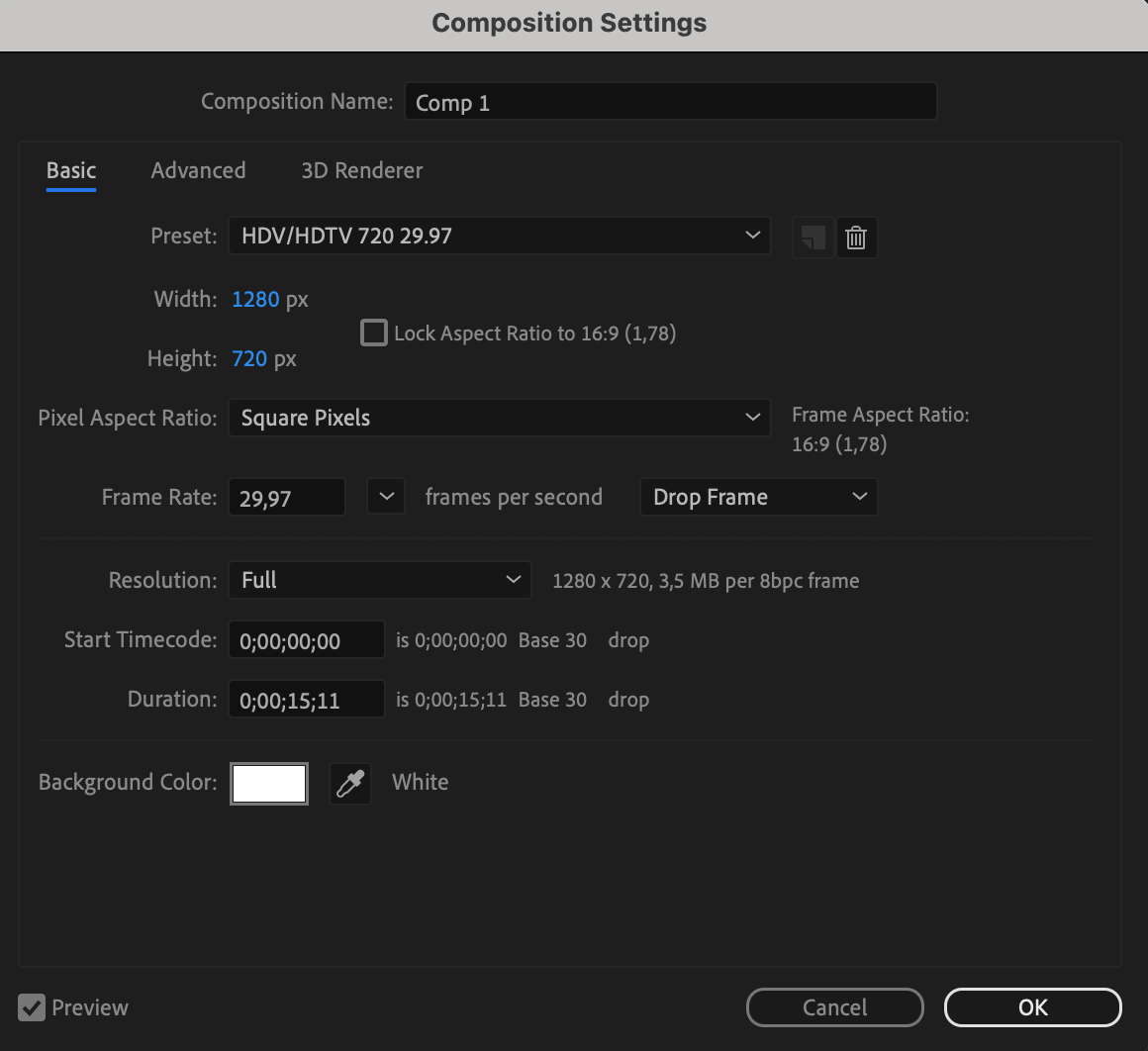 Click on “Composition” > “New Composition”. Specify the composition settings such as dimensions, duration, and background color (which will serve as a temporary background).