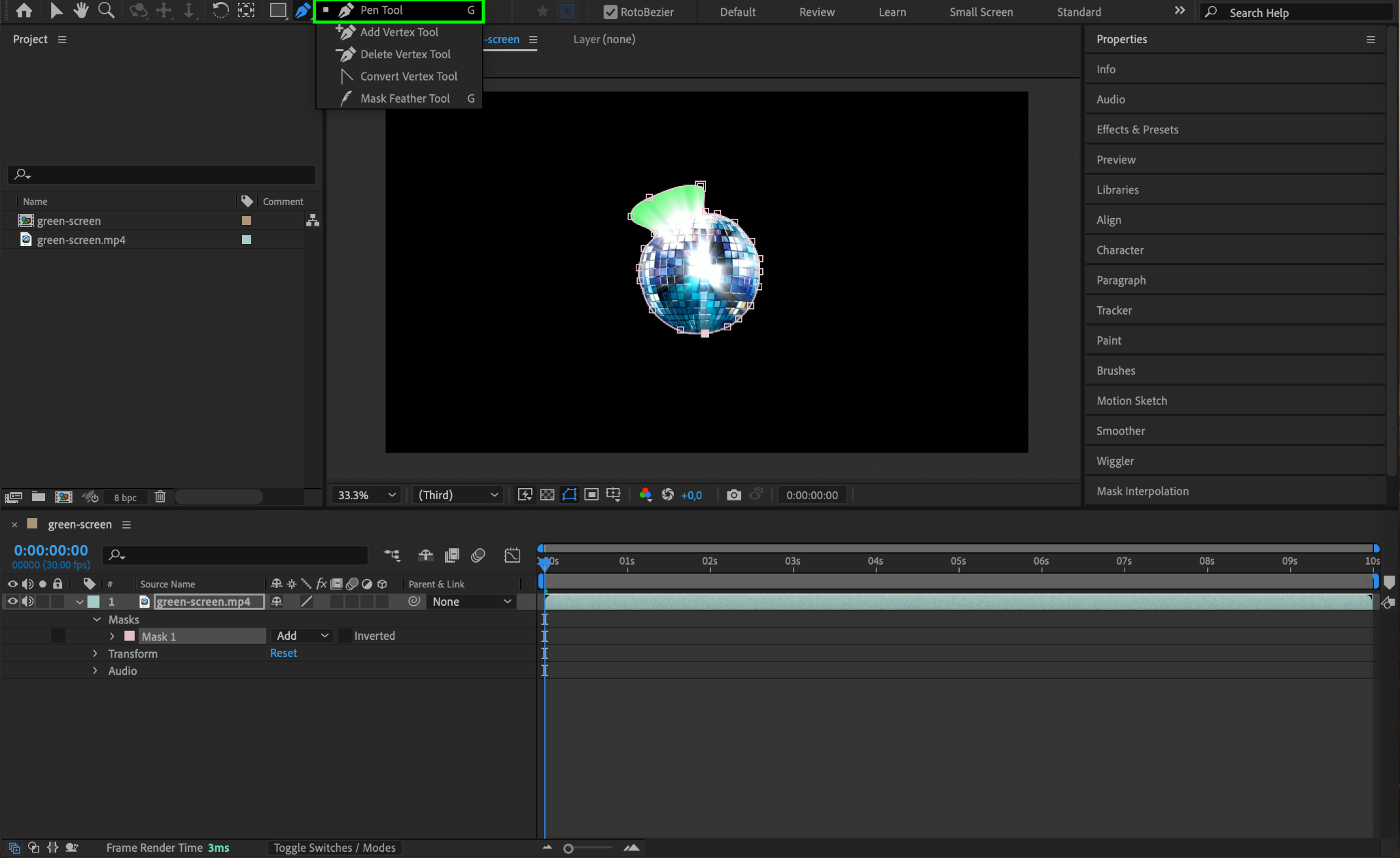 To focus on the subject, create a mask to exclude unnecessary parts of the green screen. Select the footage layer in the timeline, then use the Pen Tool (shortcut: G) to draw a mask around the subject. This helps reduce the area for keying, improving accuracy and performance. Ensure the mask mode is set to Add in the timeline.
