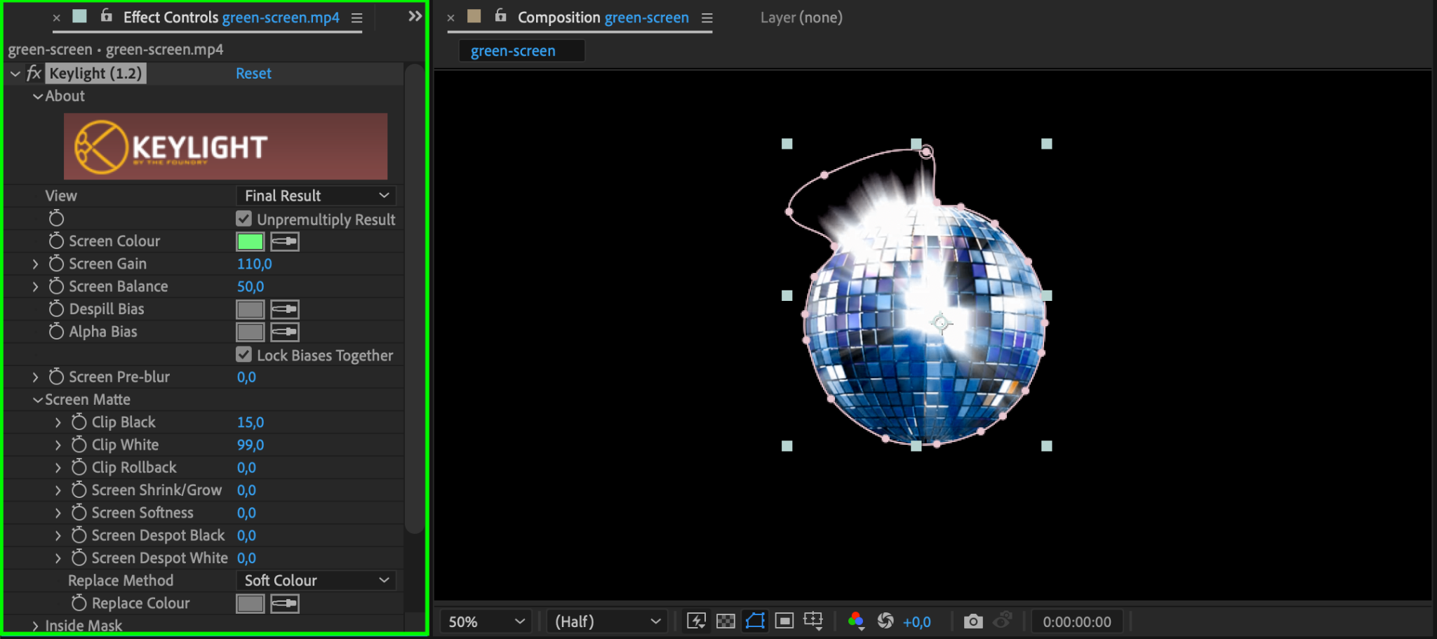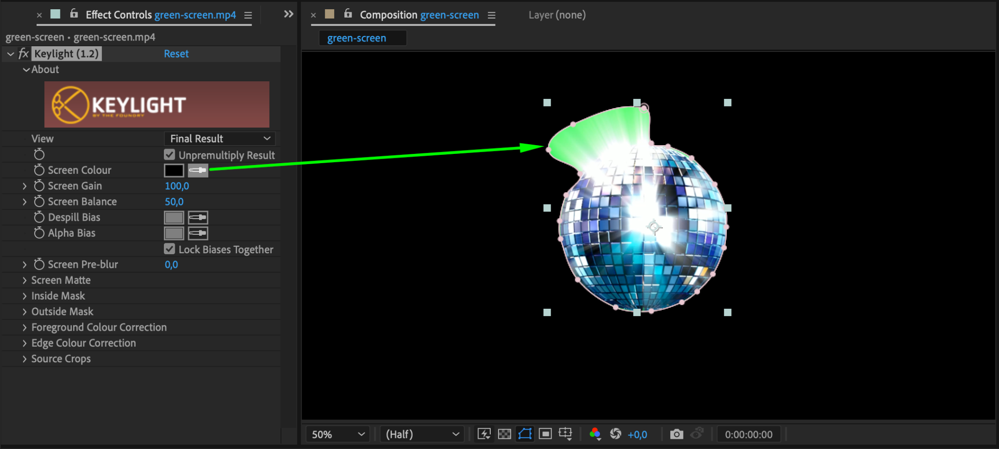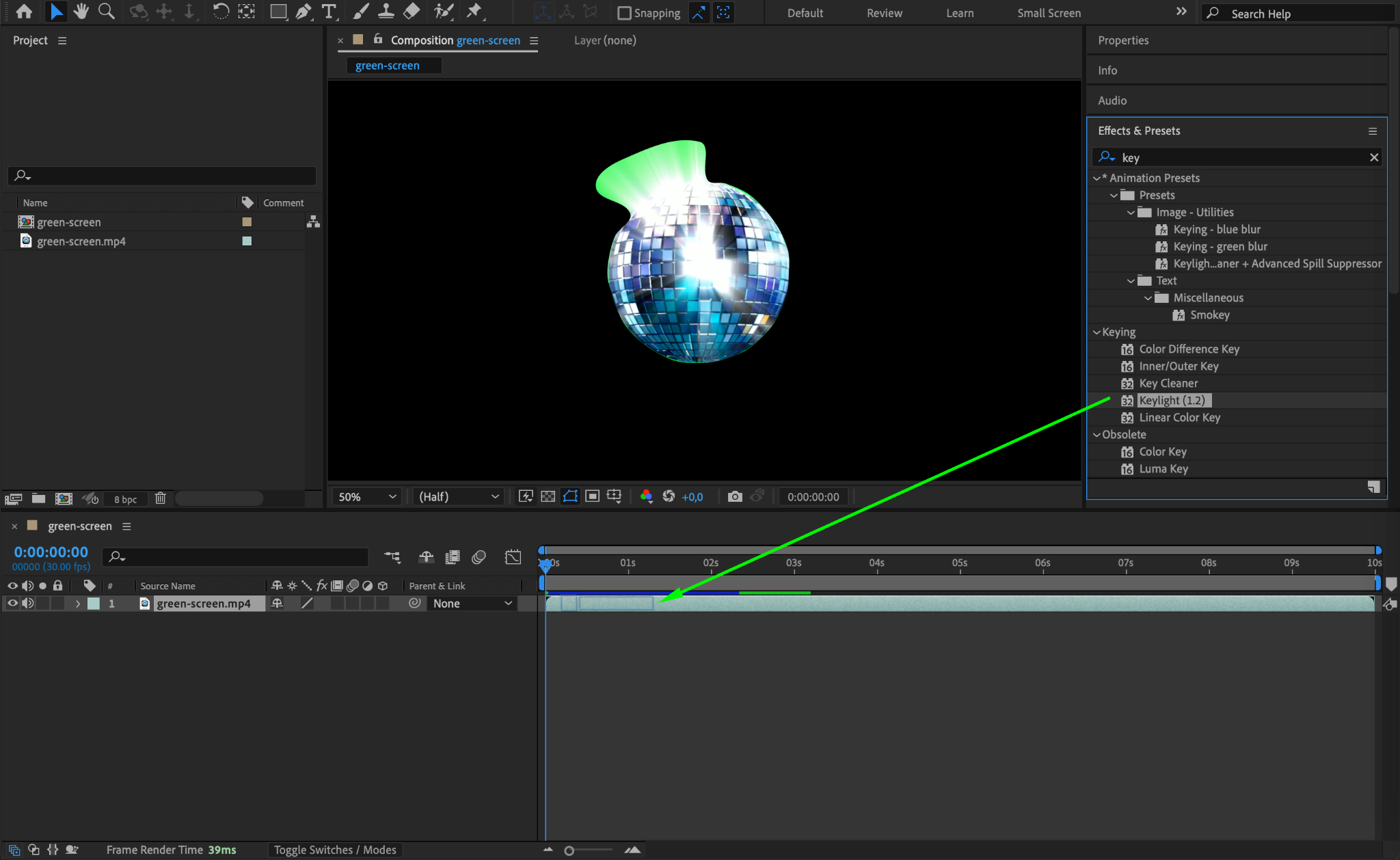 In the Effects & Presets panel, search for “Keylight (1.2).” Drag the effect onto the footage layer. Keylight is a robust tool for removing green screens, and it will help eliminate the background while preserving details in the subject.